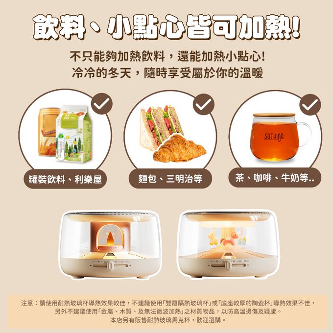 【特別說明】 使用本產品前,請先將發熱盤表面之貼紙移除!避免高溫產生貼紙加熱的氣味。 建議使用本店販售之”耐熱玻璃杯”導熱效果較佳,為避免危險請勿使用金屬、木質、無耐熱塑膠等材質之容器,陶瓷杯、雙層隔熱玻璃杯由於有隔熱作用或底座較厚的情形,導熱效果較差,請斟酌評估使用。 液體溫度與升溫速度會因不同室溫、容量、容器材質有所差異。 追求快速導熱,請使用本店販售之”耐熱玻璃杯”並請蓋上杯蓋,方可鎖住熱能達到期望溫度。