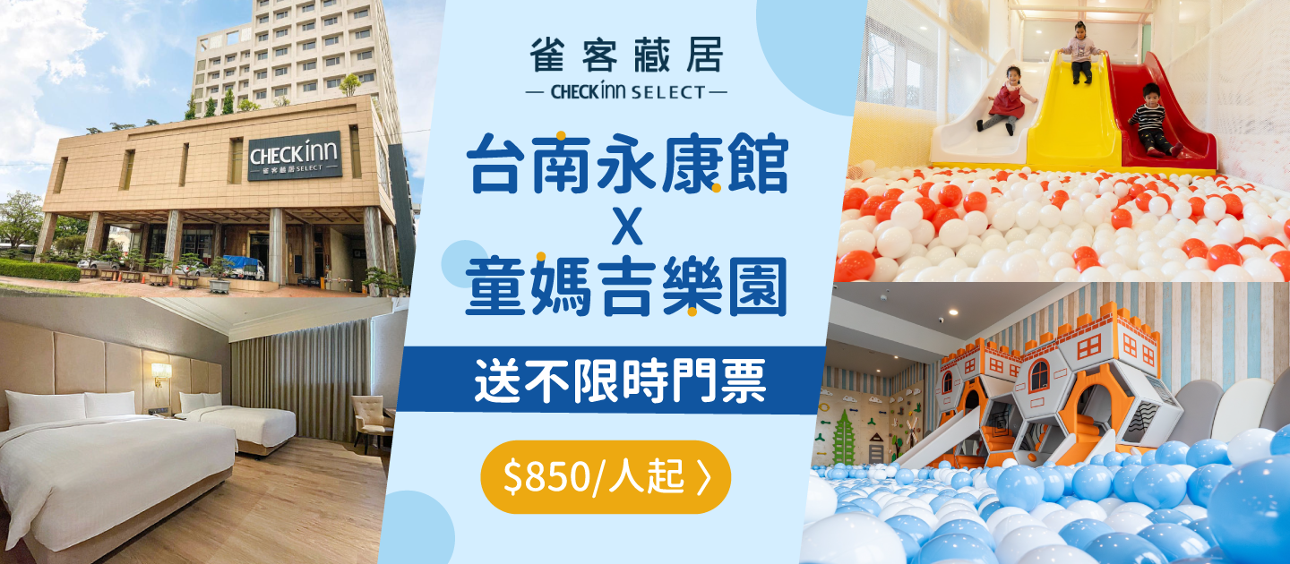 台南真的怎麼去都去不膩呀!這次來點不一樣的吧!台南的飯店裡比較少有「兒童樂園」的,所以這次開團的【雀客藏居台南永康館】加上雀客藏居近年翻新打造的室內市內「童媽吉樂園-台南永康館」,根本就是台南親子旅遊的最佳選擇!雀客藏居台南永康館位於交流道附近,交通非常便利!開車10分鐘內就有台灣歷史博物館,20分鐘內也有歷史文化氣息濃厚的赤崁樓、孔廟,或是近年很夯的奇美博物館!超級適合一次訂個兩晚、孝親帶長輩一起同樂的!