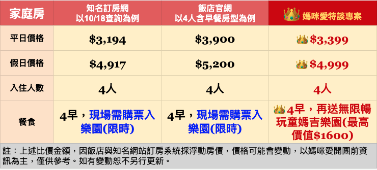 不比不知道,一比嚇一跳!絕無僅有的超殺代訂房方案!專案等於官網打87折之外,再送最高價值$1600的童媽吉樂園暢玩(兩日份)!(其他非親子專案訂房,現場可是還要加價的,而且每天都要重新買!我們直接送、還不限時!退房後還可玩到12:00!)