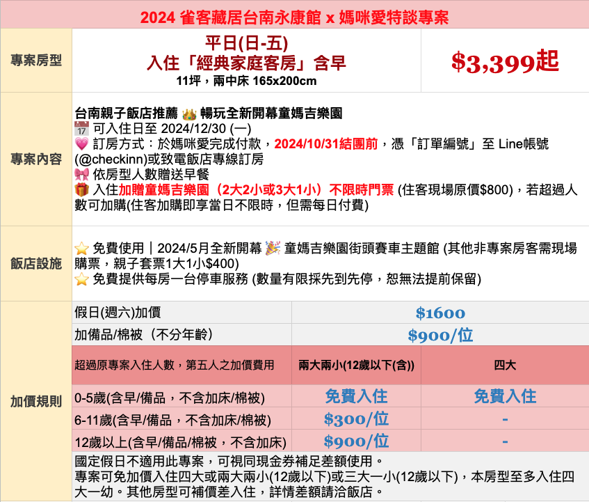註:本專案為「平日(日-五)入住經典家庭客房一泊一食」線上代訂房專案,於媽咪愛完成付款後,需在2024/10/31前,憑「訂單編號」至 Line帳號(點我前往)訂房。逾期將主動為您取消訂單。