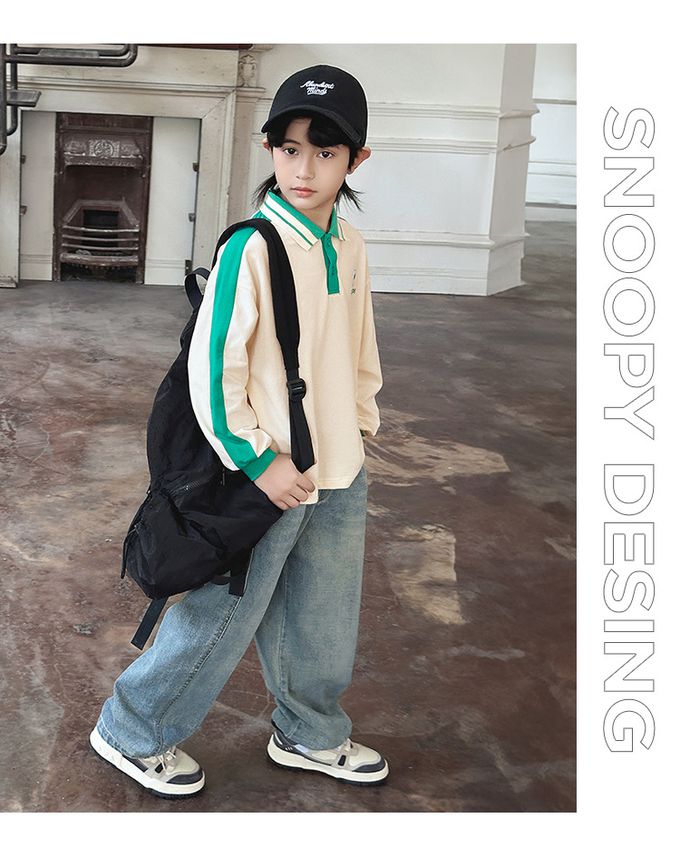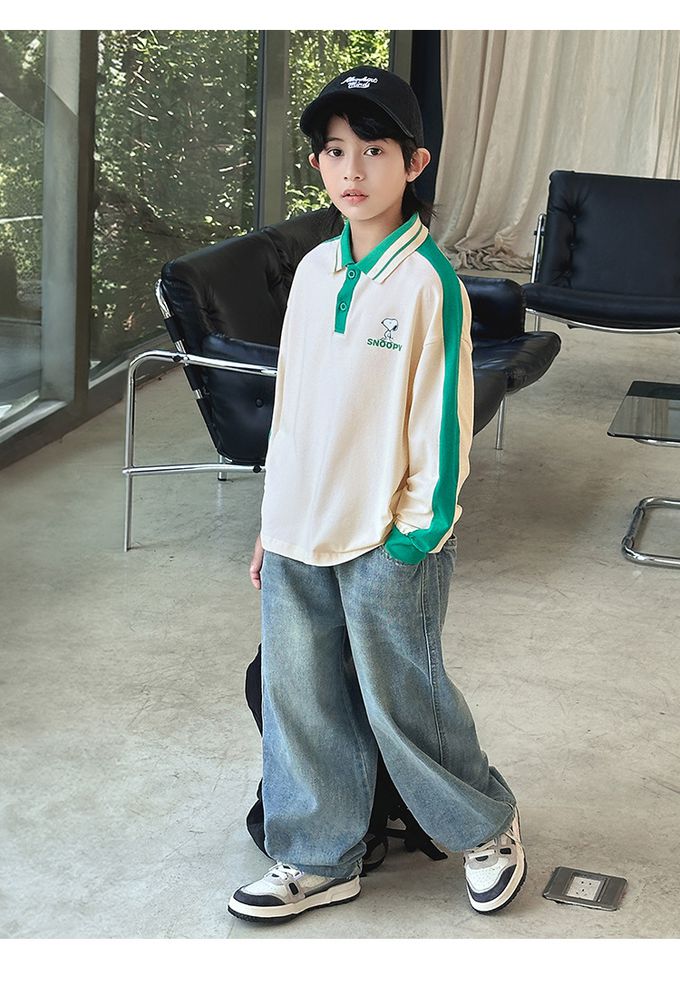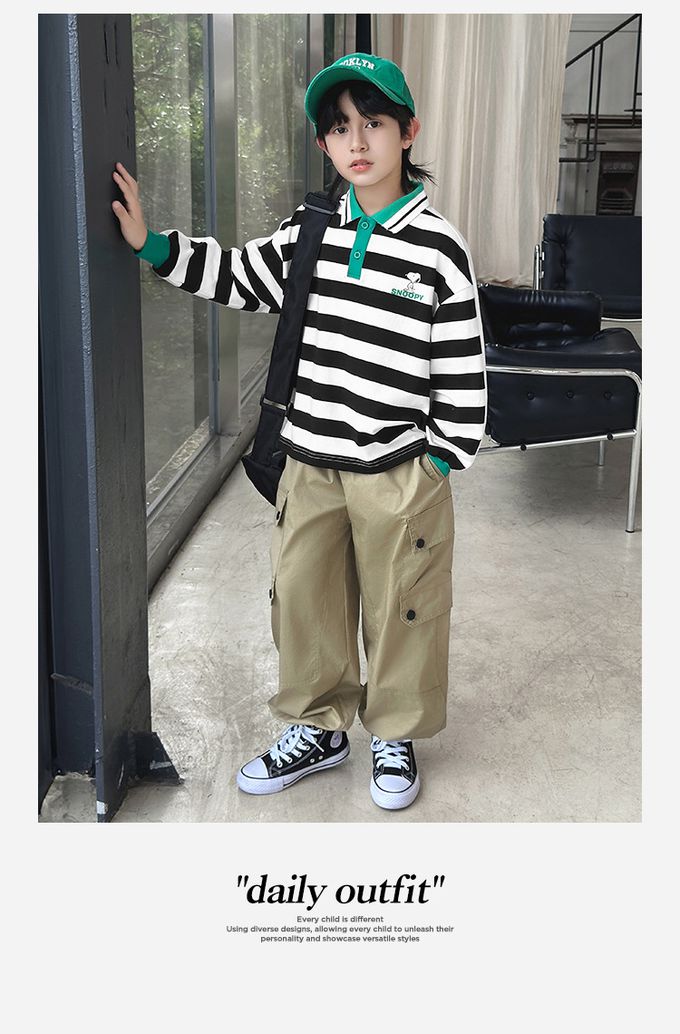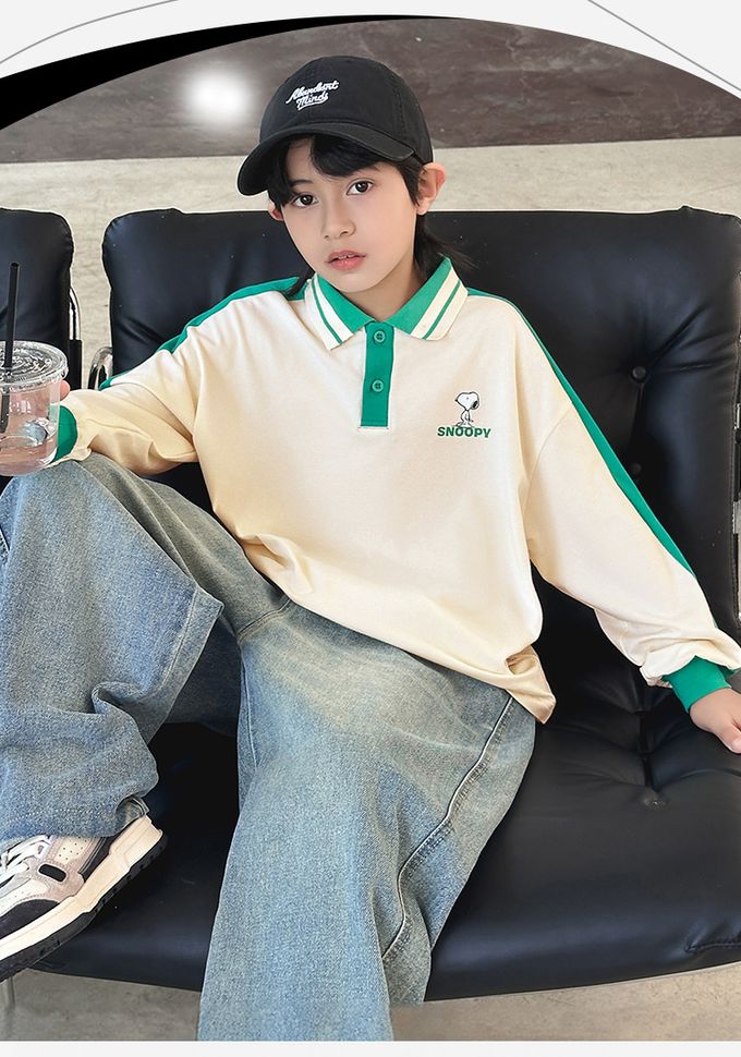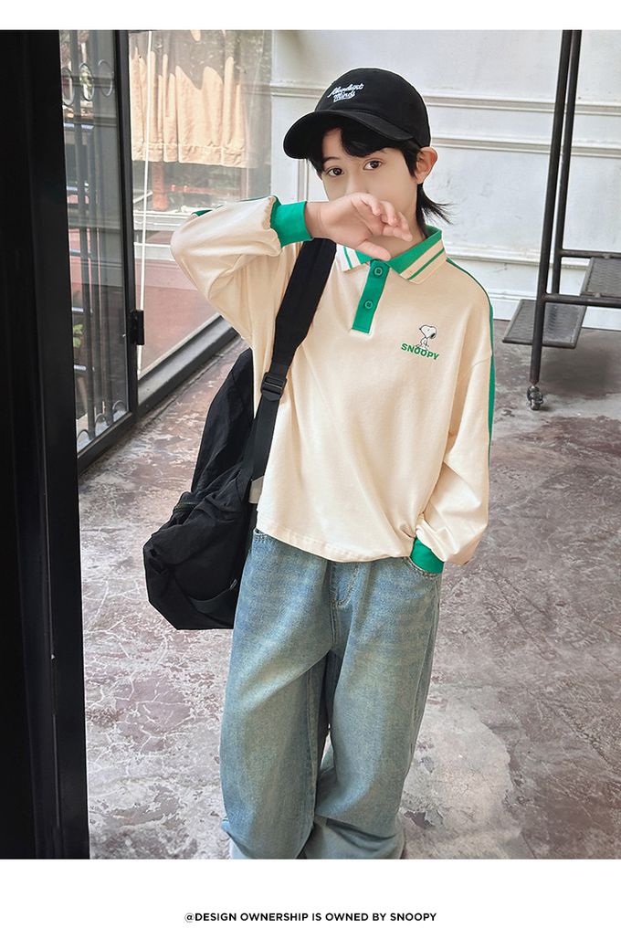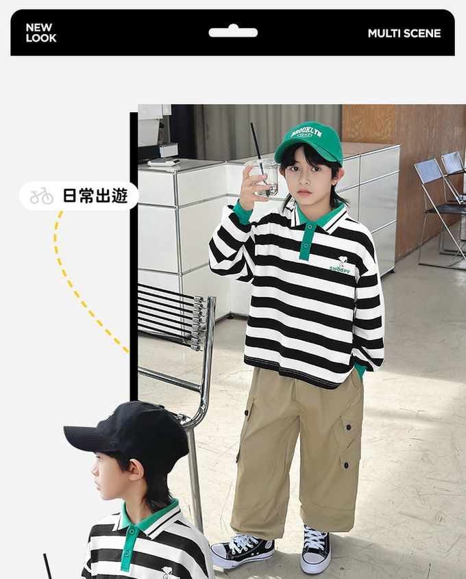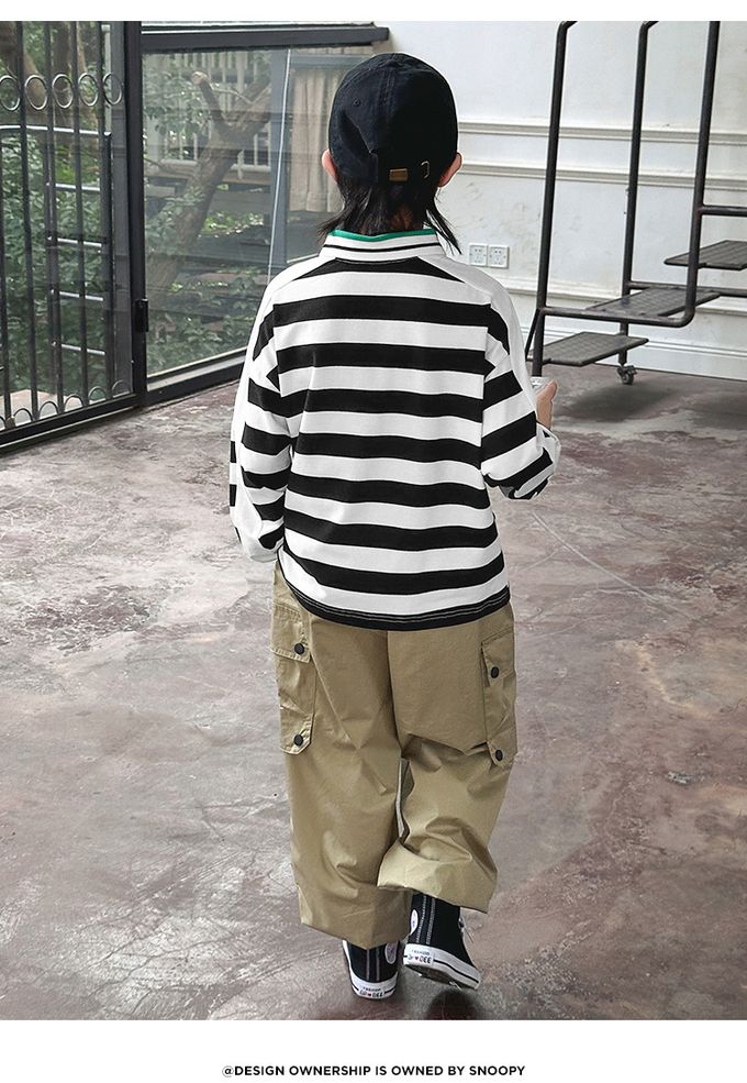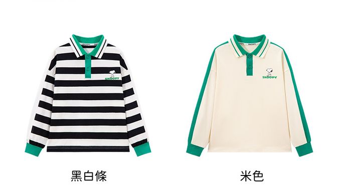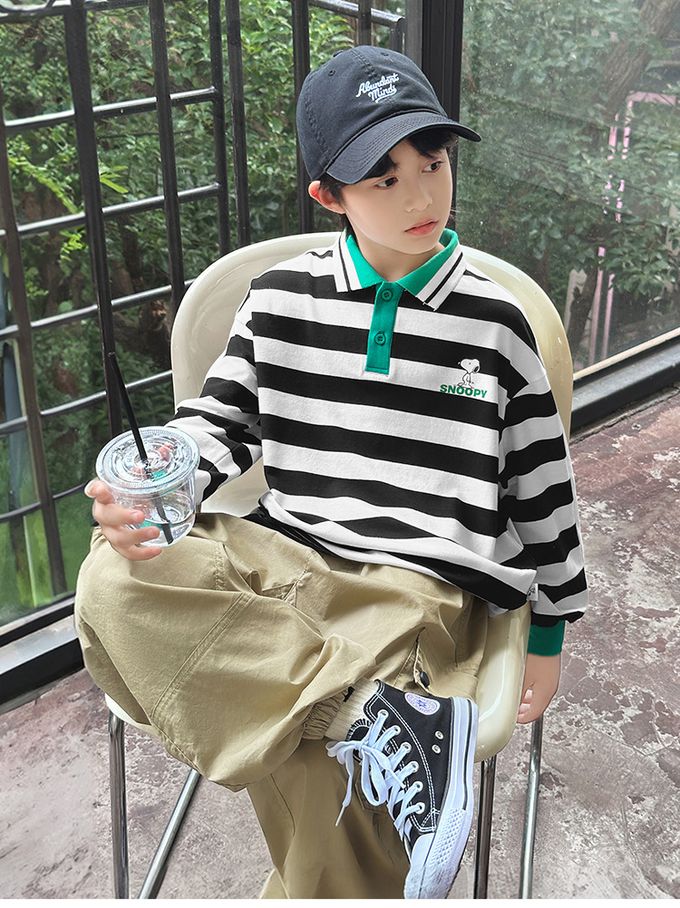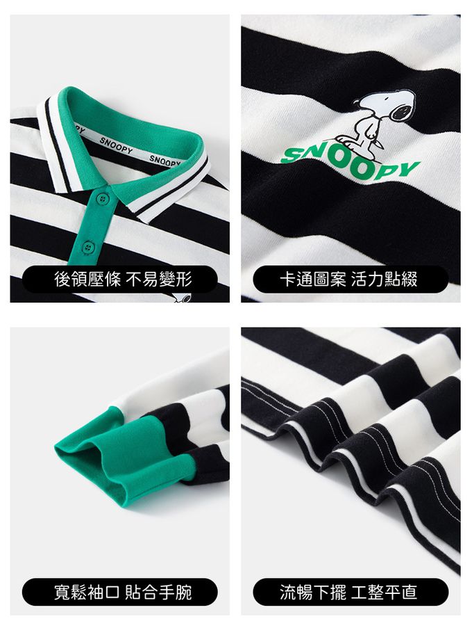 休閒率性翻領長袖上衣/polo衫-卡通SNOOPY-黑白條