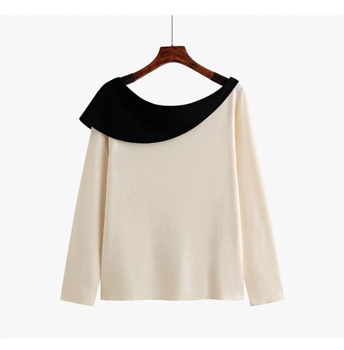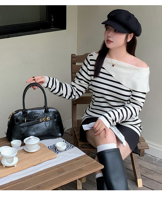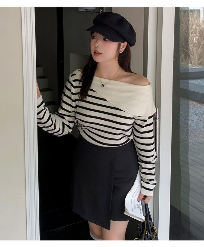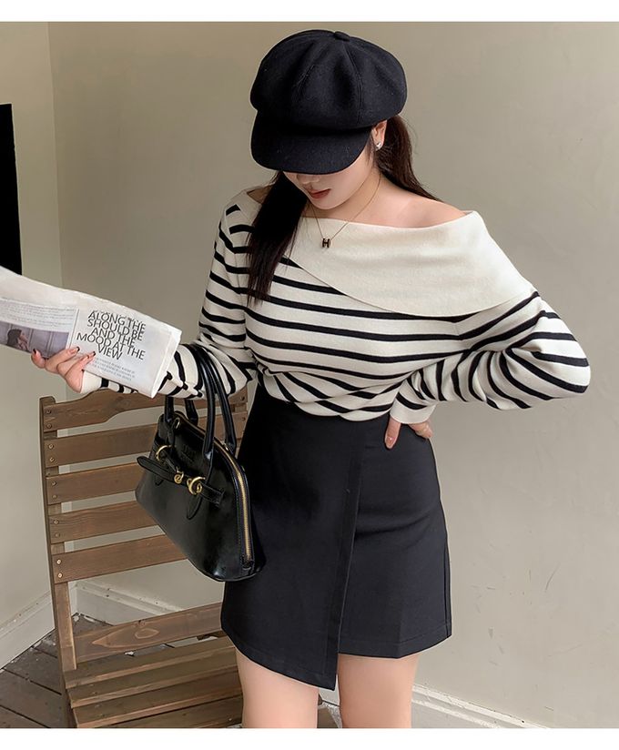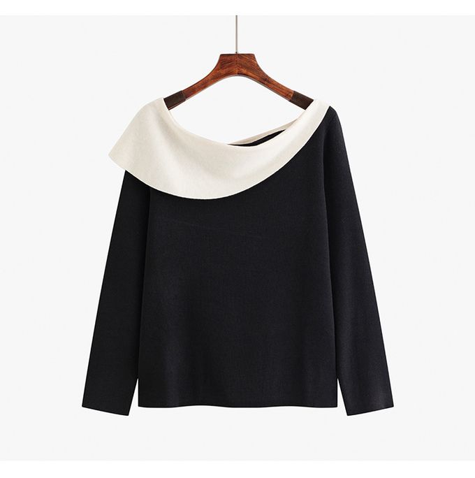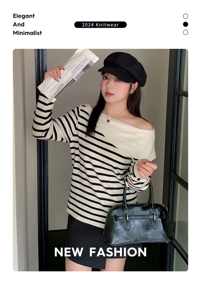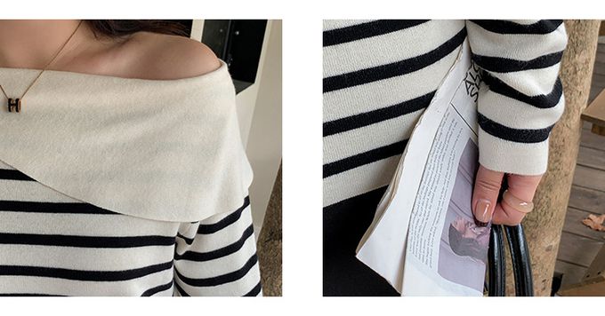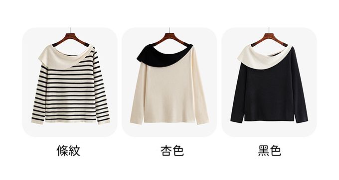 品名:羊毛一字領露肩針織長袖上衣