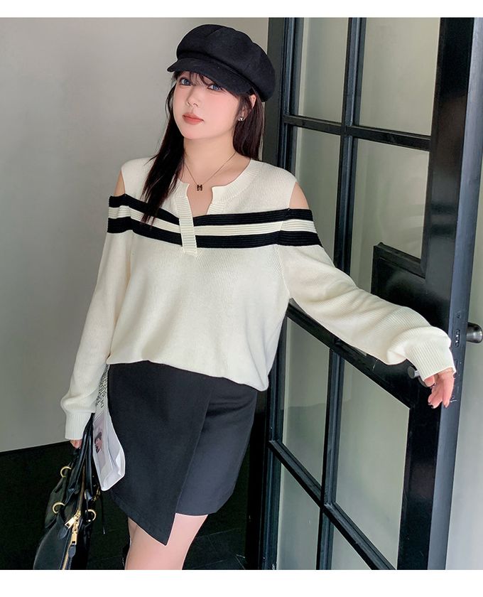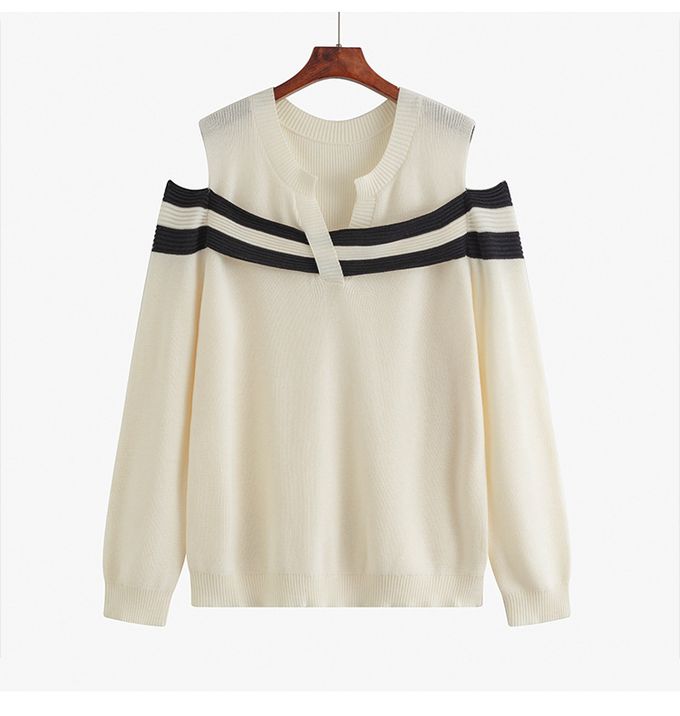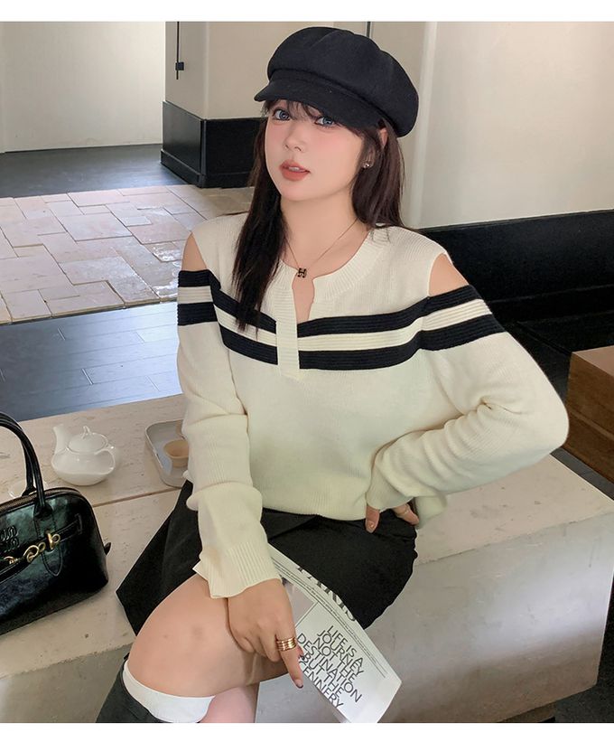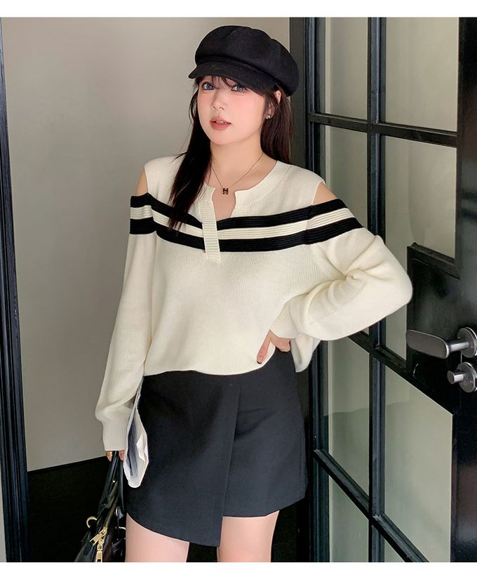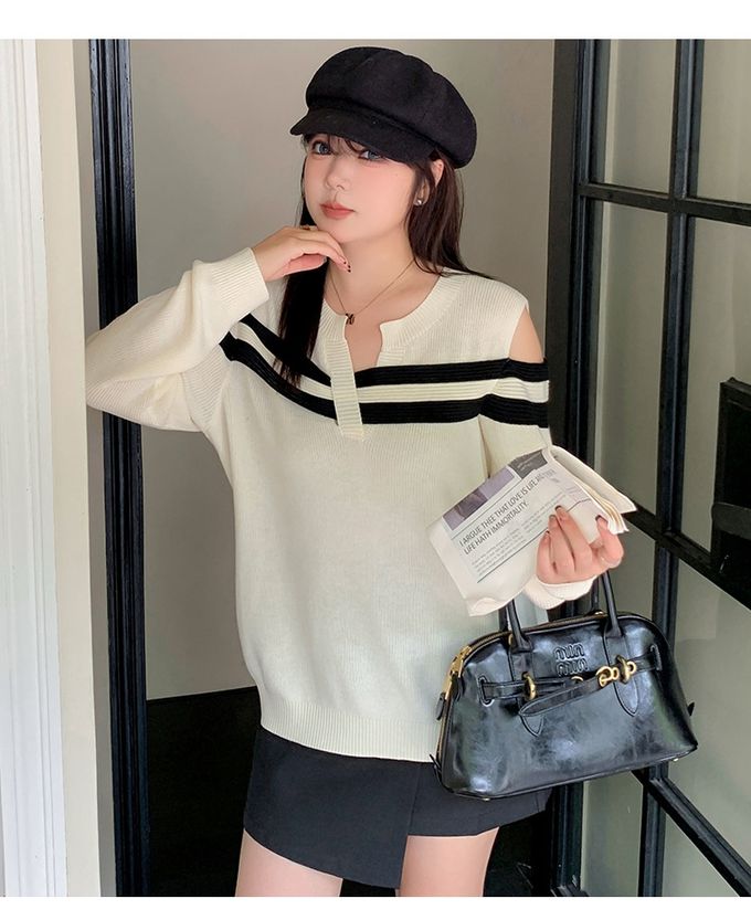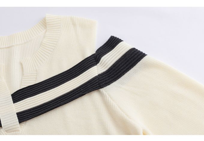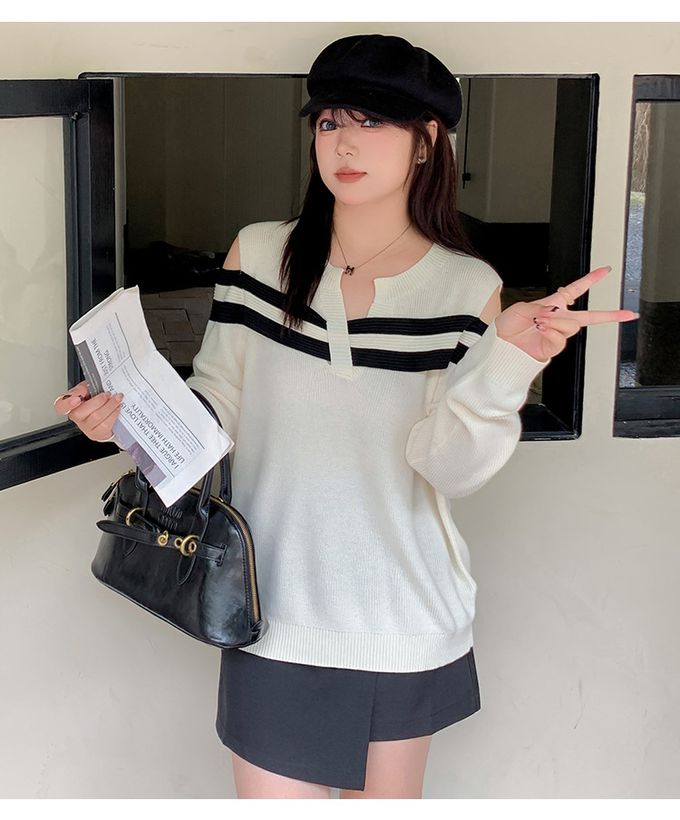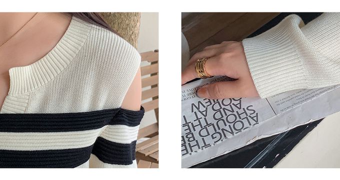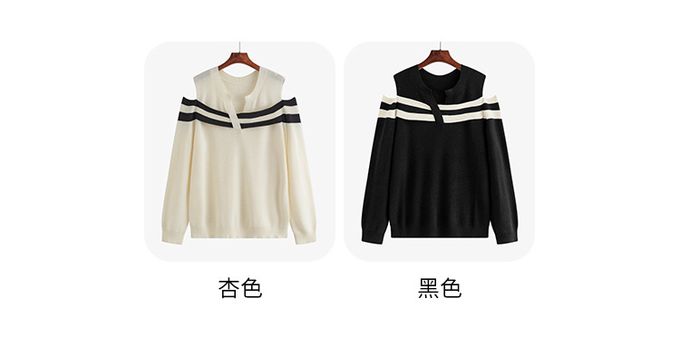 品名:羊毛撞色條紋露肩針織長袖上衣
