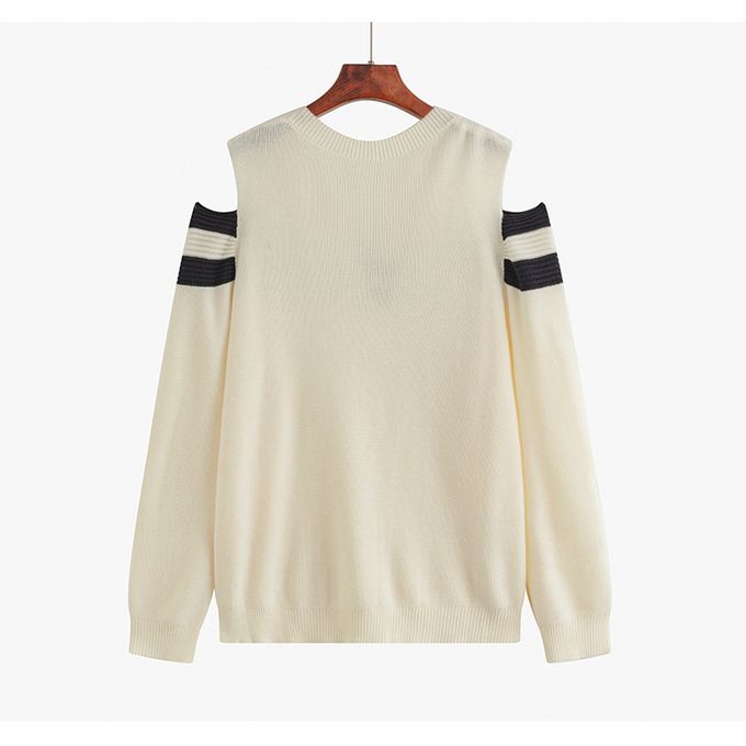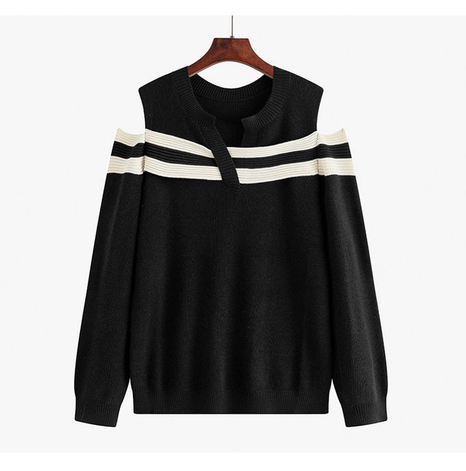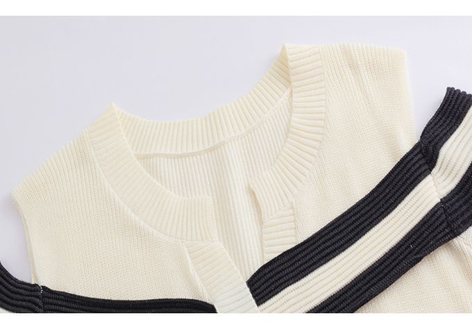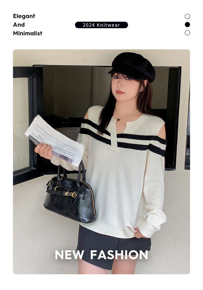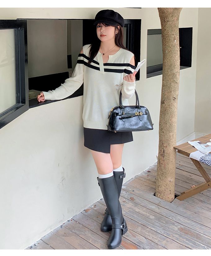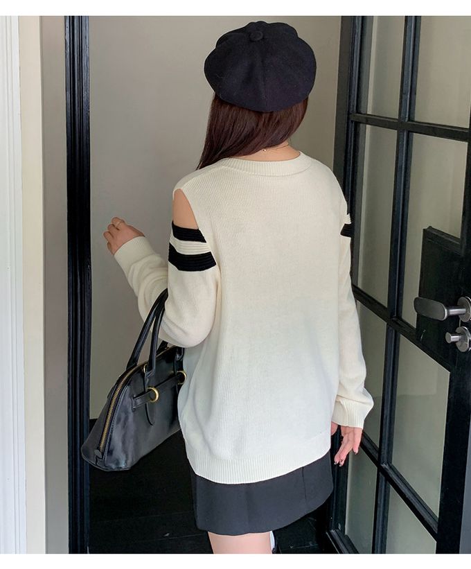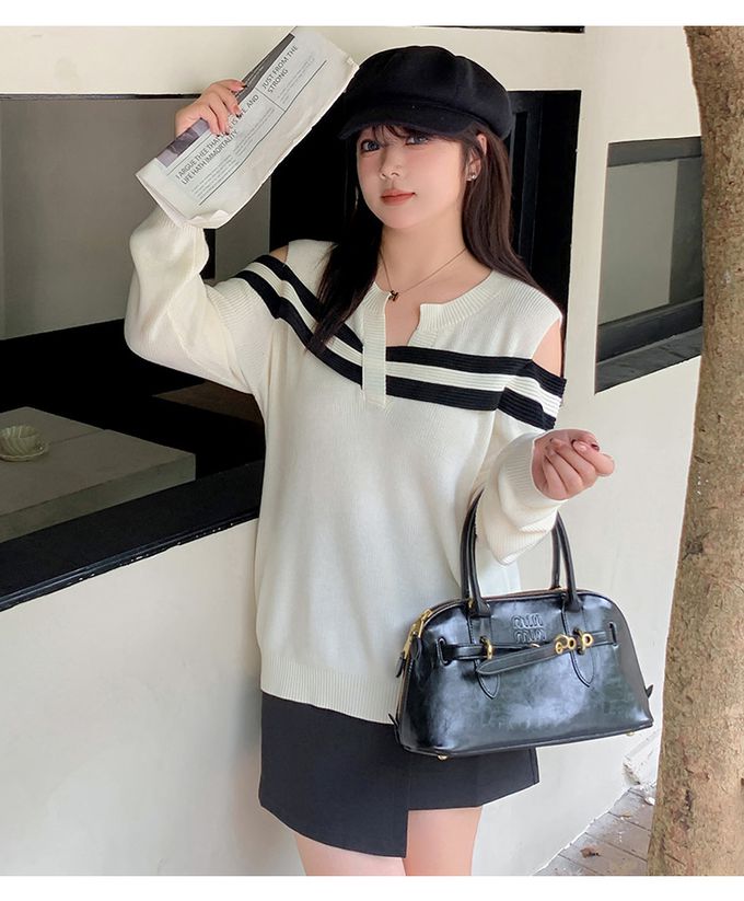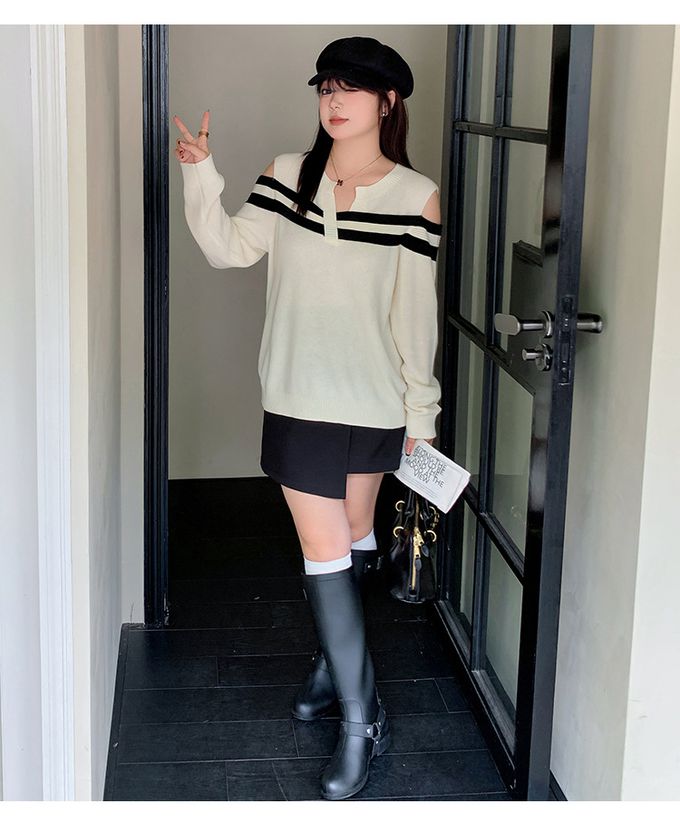 品名:羊毛撞色條紋露肩針織長袖上衣