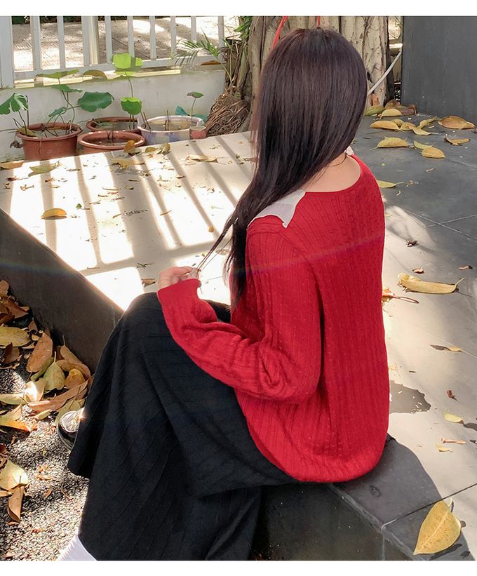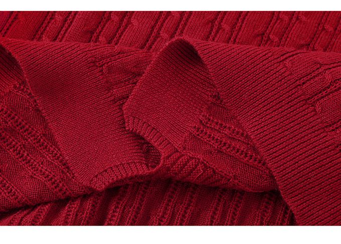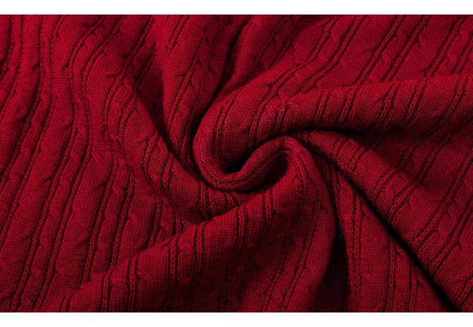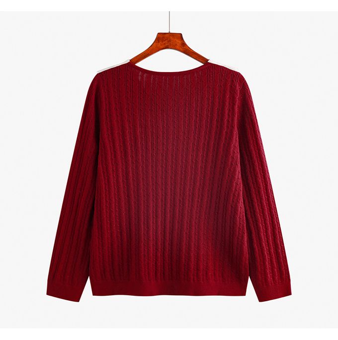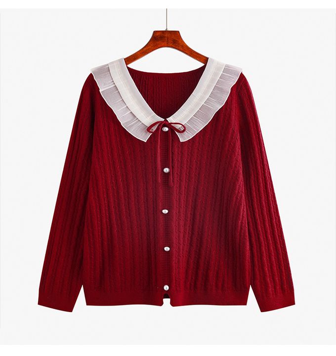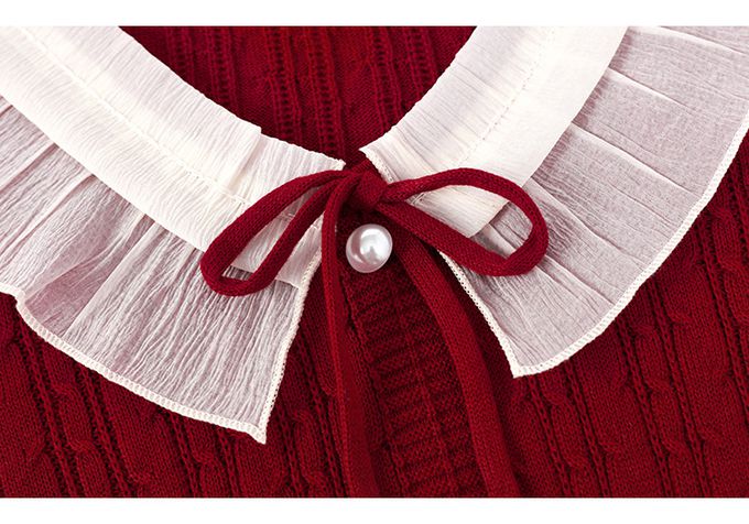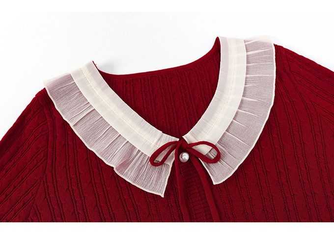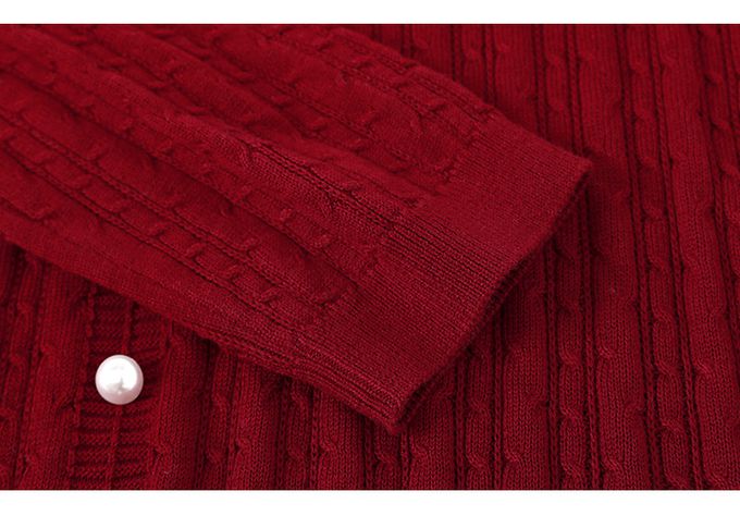羊毛氣質荷葉邊麻花針織長袖上衣-紅色