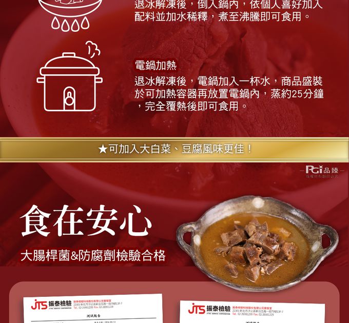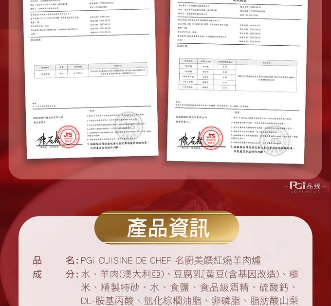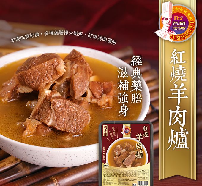 成分:紅燒:羊肉(澳大利亞)、豆腐乳【黃豆(含基因改造)、糙米、精製特砂、水、食鹽、食品級酒精、硫酸鈣、DL-胺基丙酸、豆類、品質改良劑(氫化棕櫚脂、卵磷脂、脂肪酸山梨醇酐酯、二氧化矽)、甜味劑(醋磺內酯鉀)】、番茄醬【番茄糊、水、蔗糖、釀造醋、食鹽、乙醯化己二酸二澱粉、香辛料 (白胡椒、肉桂、紅辣椒、薑、丁香、肉豆蔻、芥末、月桂葉、眾香子)、玉米糖膠】、麻油【大豆油、芝麻油】、大骨粉【鹽、調味劑 (L-麩酸鈉、胺基乙酸、琥珀酸二鈉、5´-次黃嘌呤核苷磷酸二鈉、5´-鳥嘌呤核苷磷酸二鈉)、麥芽糊精、糖、豬肉粉〔乳糖、醬油粉、植物水解蛋白(大豆、玉米、小麥)、DL-胺基丙酸、精製芥花油、豬肉抽出物、葡萄糖、D-木糖〕、洋蔥粉、品質改良劑(二氧化矽)、香料、甘草、薑母、當歸(調味用)、白胡椒】、冰糖、鹽、辣椒粉、八角、川芎、當歸、桂皮、花椒、食用紅色六號、食用黃色五號 甘蔗:羊肉(澳洲)、甘蔗汁、洋蔥、米酒(米、食用酒精)、大骨粉{鹽、調味劑 (L-麩酸鈉、胺基乙酸、琥珀酸二鈉、5´-次黃嘌呤核苷磷酸二鈉、5´-鳥嘌呤核苷磷酸二鈉)、麥芽糊精、糖、豬肉粉[乳糖、醬油粉、植物水解蛋白(大豆、玉米、小麥)、調味劑(DL-胺基丙酸)、芥花油、豬肉抽出物(含豬骨)、葡萄糖、D-木糖]、洋蔥粉、品質改良劑(二氧化矽)、香料、甘草、薑母、當歸(調味用)、白胡椒}、薑片、鹽、冰糖、枸杞、蒜仁、當歸、紅棗、花椒、孜然