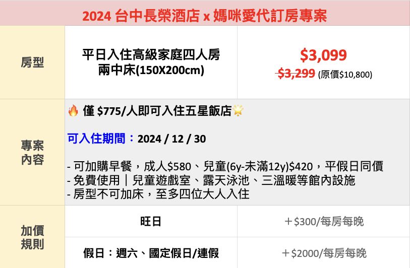 註 1:專案內容皆不含早餐,早餐可於現場加購(免收服務費),大人每位 $580、6歲-未滿12歲兒童 $420,平假日同價,如有變動以飯店官網為主。每房固定提供 4 份備品,如需現場加購備品一份 $300。