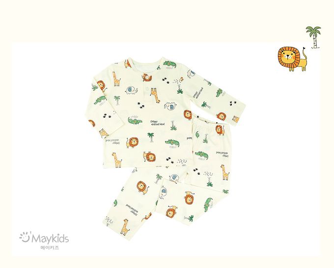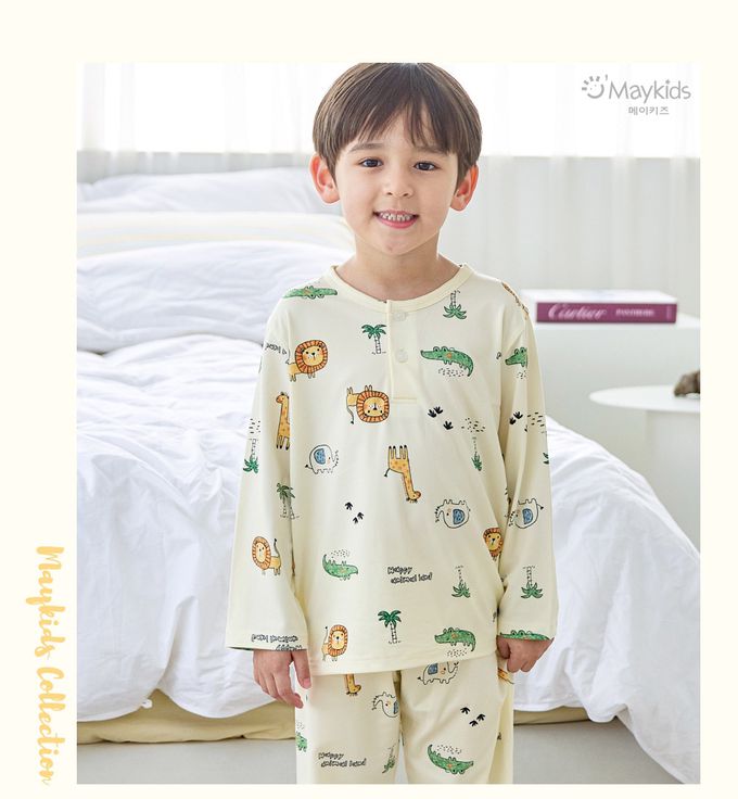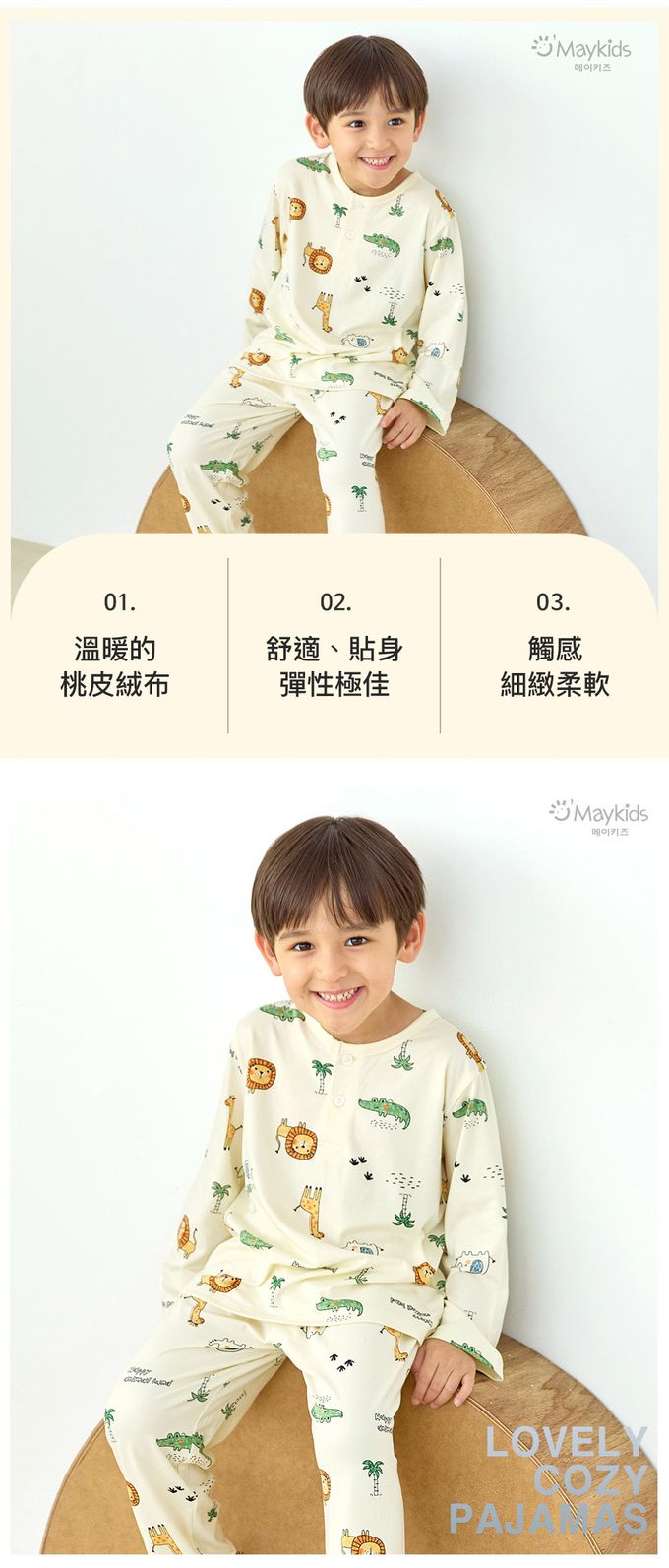 韓國 Maykids - 溫暖桃皮絨長袖睡衣套裝-童趣動物園-淺黃