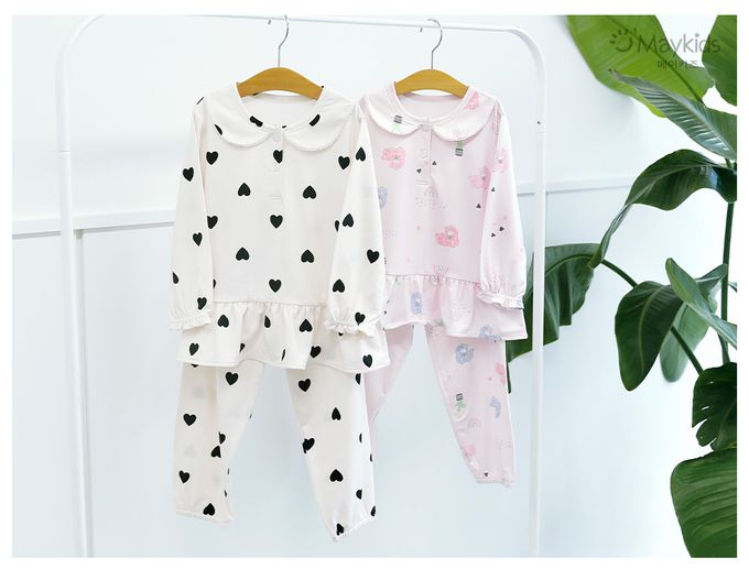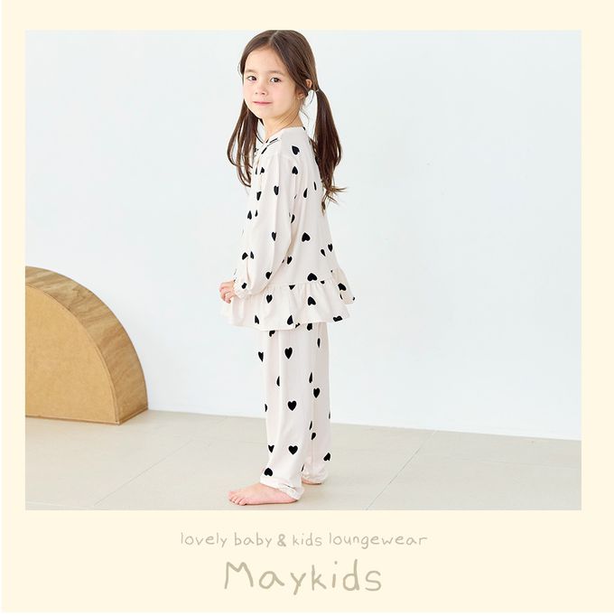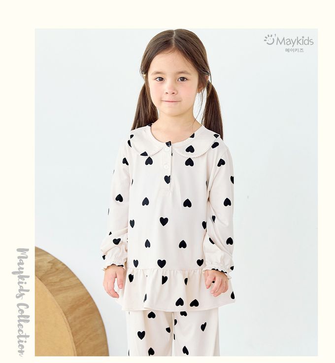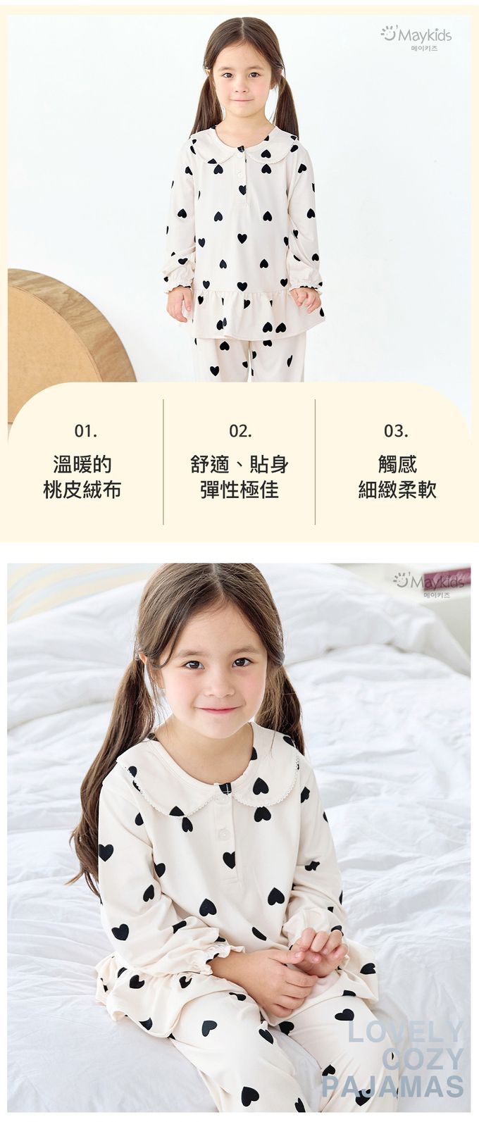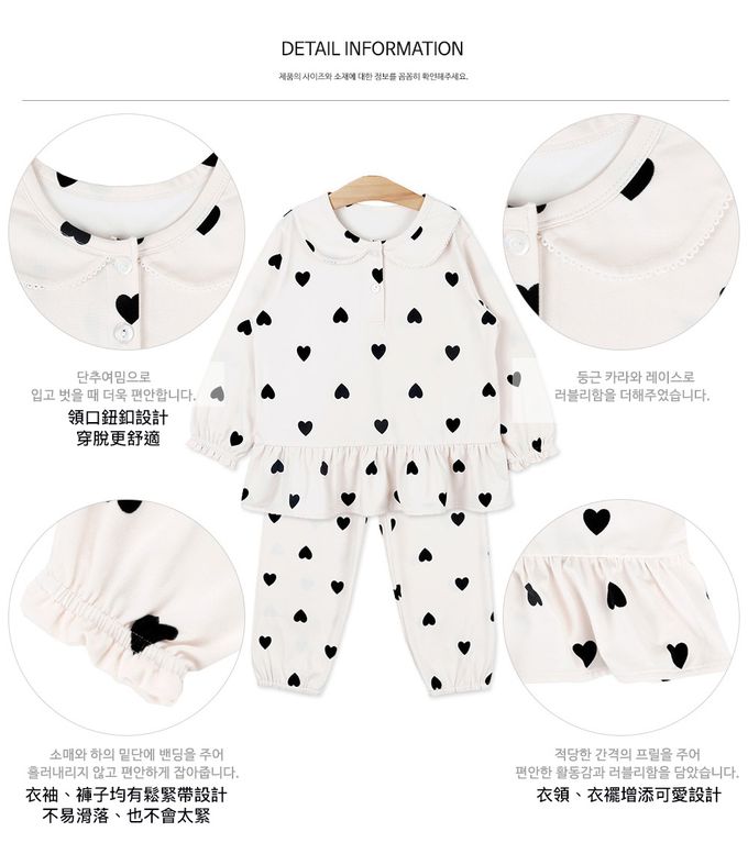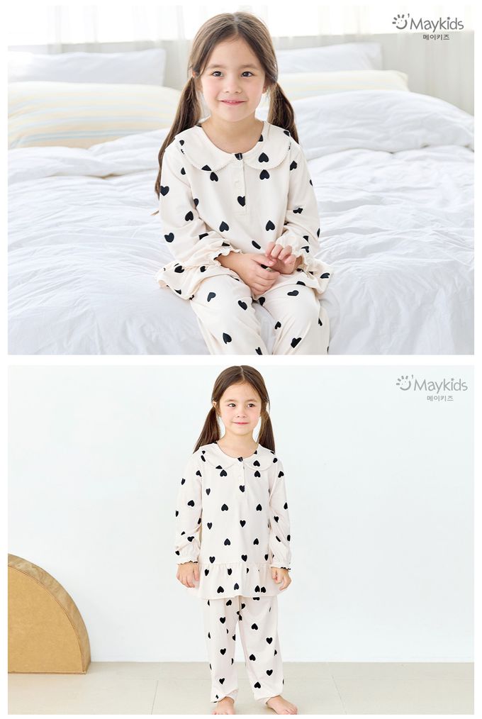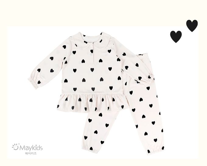 韓國 Maykids - 溫暖桃皮絨長袖睡衣套裝-黑愛心-米白