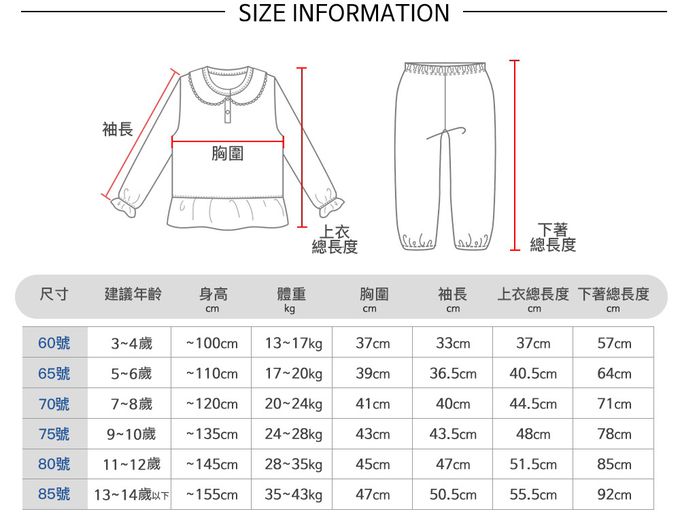 1. 尺寸表單位皆為公分(cm),實際尺寸會因布料彈性、水洗、測量起迄點等因素略有誤差。購買前,建議參考寶貝現有的衣物尺寸做對照。