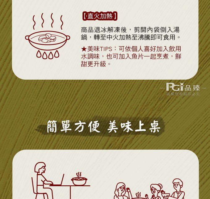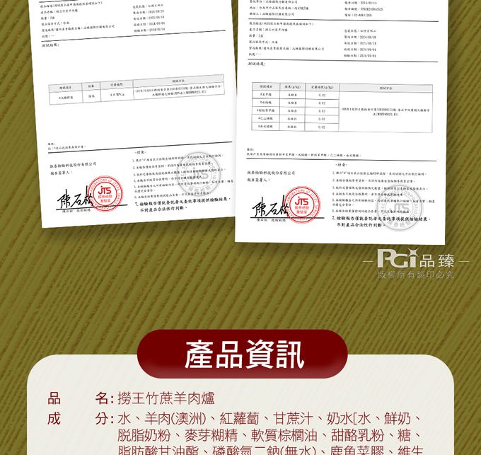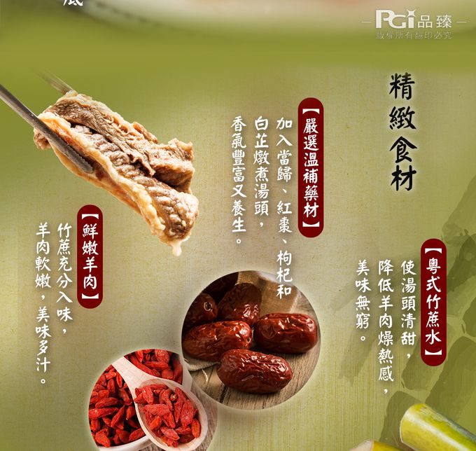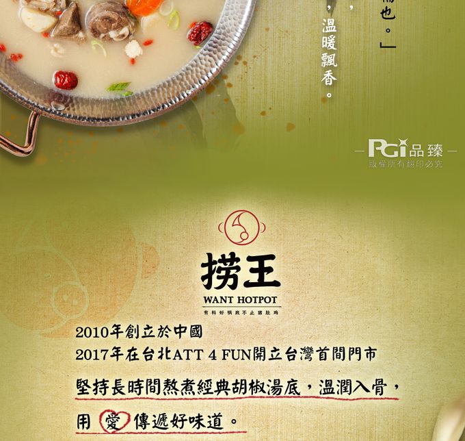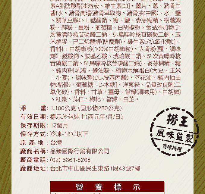 成分:【撈王】經典胡椒豬肚雞鍋:水、豬肚(台灣)、雞肉、高湯[水、豬骨(台灣)、蔥、薑、蒜頭、鹽]、奶水[水、鮮奶、脫脂奶粉、麥芽糊精、軟質棕櫚油、酪乳粉(牛乳)、糖、脂肪酸甘油酯、磷酸氫二鈉(無水)、鹿角菜膠、維生素A脂肪酸酯油溶液、維生素D3]、白胡椒粉(100%白糊椒粒)、紅棗、豬骨白醬{水、豬骨高湯(豬骨萃取物、豬骨、水、鹽、關華豆膠)、L-麩酸鈉、糖、鹽、麥芽糊精、樹薯澱粉、蒜粉、薑粉、葡萄糖、白胡椒粉、食品添加物[5'-次黃嘌呤核苷磷酸二鈉、5'-鳥嘌呤核苷磷酸二鈉、玉米糖膠、己二烯酸鉀(防腐劑)、維生素E(抗氧化劑)]、香料}、蔥、蒜仁、薑片、枸杞、鹽 【撈王】竹蔗羊肉爐:水、羊肉(澳洲)、紅蘿蔔、甘蔗汁、白胡椒粉(100%白糊椒粒)、奶水[水、鮮奶、脫脂奶粉、麥芽糊精、軟質棕櫚油、甜酪乳粉、糖、脂肪酸甘油酯、磷酸氫二鈉(無水)、鹿角菜膠、維生素A脂肪酸酯油溶液、維生素D3]、薑片、蔥、豬骨白醬{水、豬骨高湯(豬骨萃取物、豬骨油、水、鹽、關華豆膠)、L-麩酸鈉、糖、鹽、麥芽糊精、樹薯澱粉、蒜粉、薑粉、葡萄糖、白胡椒粉、食品添加物〔5'-次黃嘌呤核苷磷酸二鈉、5´-鳥嘌呤核苷磷酸二鈉、玉米糖膠、己二烯酸鉀(防腐劑)、維生素E(抗氧化劑)〕、香料}、大骨粉{鹽、調味劑(L-麩酸鈉、胺基乙酸、琥珀酸二鈉、5´-次黃嘌呤核苷磷酸二鈉、5´-鳥嘌呤核苷磷酸二鈉)、麥芽糊精、糖、豬肉粉[乳糖、醬油粉、植物水解蛋白(大豆、玉米、小麥)、調味劑(DL-胺基丙酸)、芥花油、豬肉抽出物(豬骨)、葡萄糖、D-木糖]、洋蔥粉、品質改良劑(二氧化矽)、香料、甘草、薑母、當歸(調味用)、白胡椒}、紅棗、蒜仁、枸杞、當歸、白芷