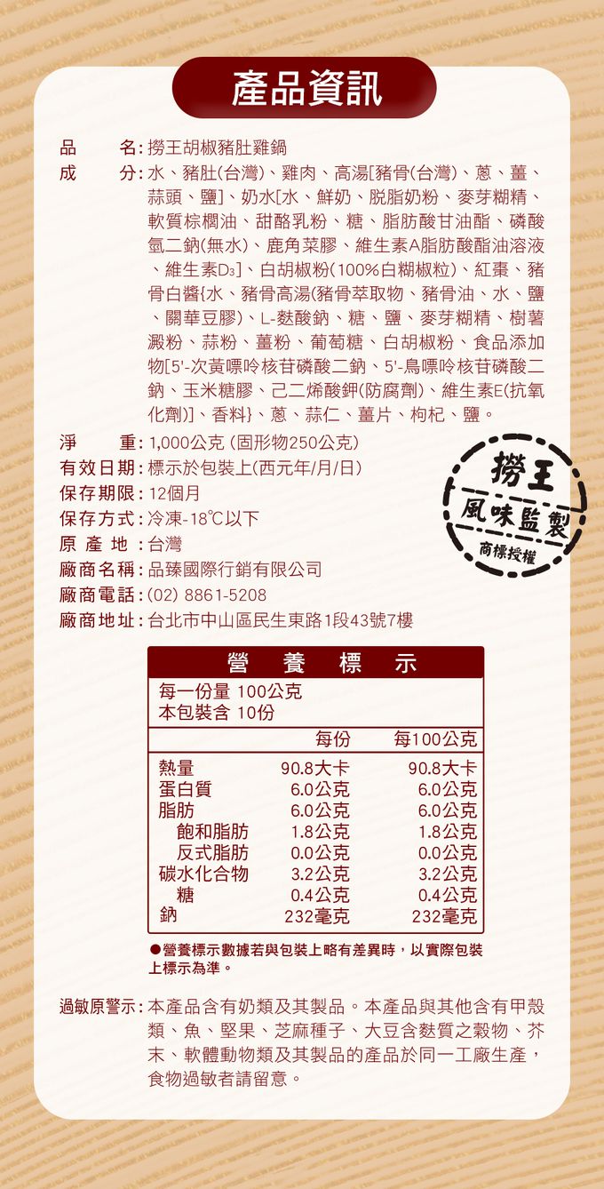過敏原:【撈王】經典胡椒豬肚雞鍋:本產品含有奶類及其製品。本產品與其他含有甲殼類、魚、堅果、芝麻種子、大豆含麩質之穀物、芥末、軟體動物類及其製品的產品於同一工廠生產,食物過敏者請留意。 【撈王】竹蔗羊肉爐:本產品含麩質之穀物、大豆、奶類及其製品