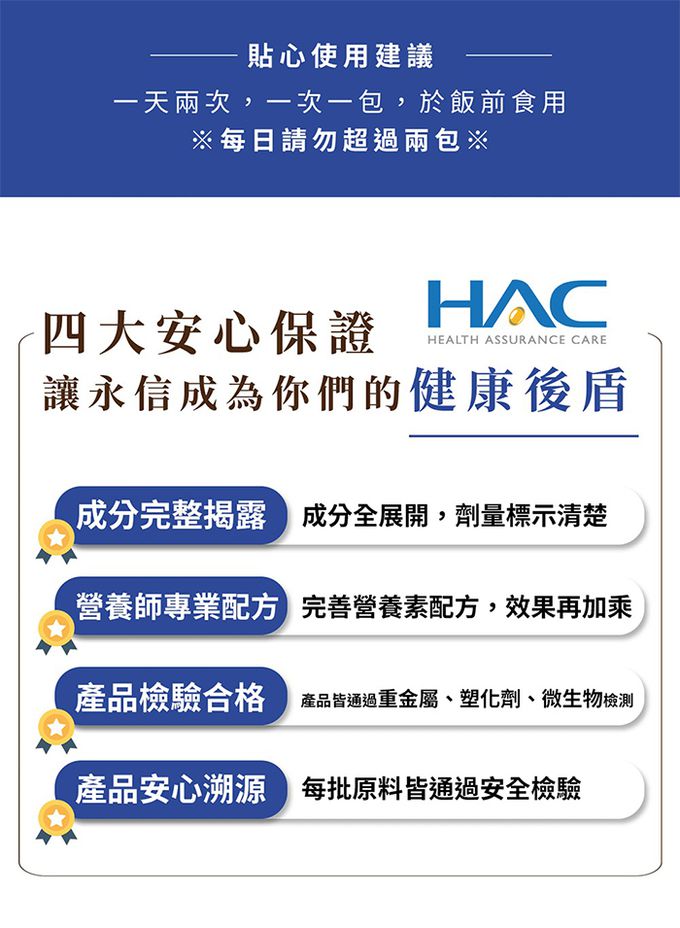 使用方式:每次1包,每日2次,於任2餐後以溫水配食。
