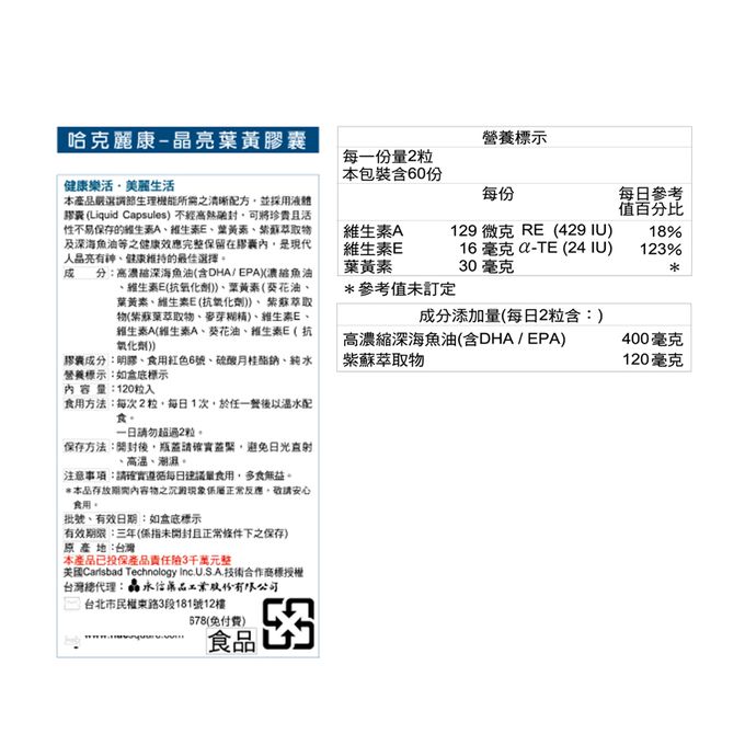 品名:哈克麗康-晶亮葉黃膠囊x5瓶(120粒/瓶)