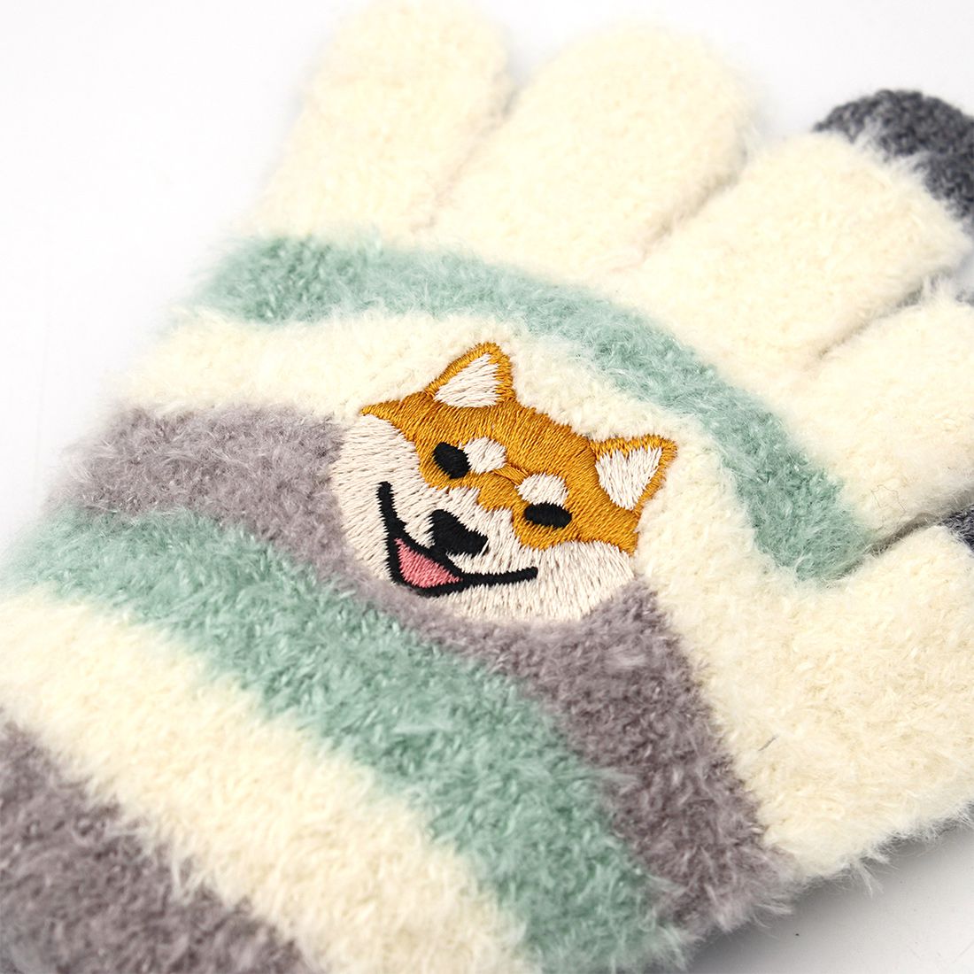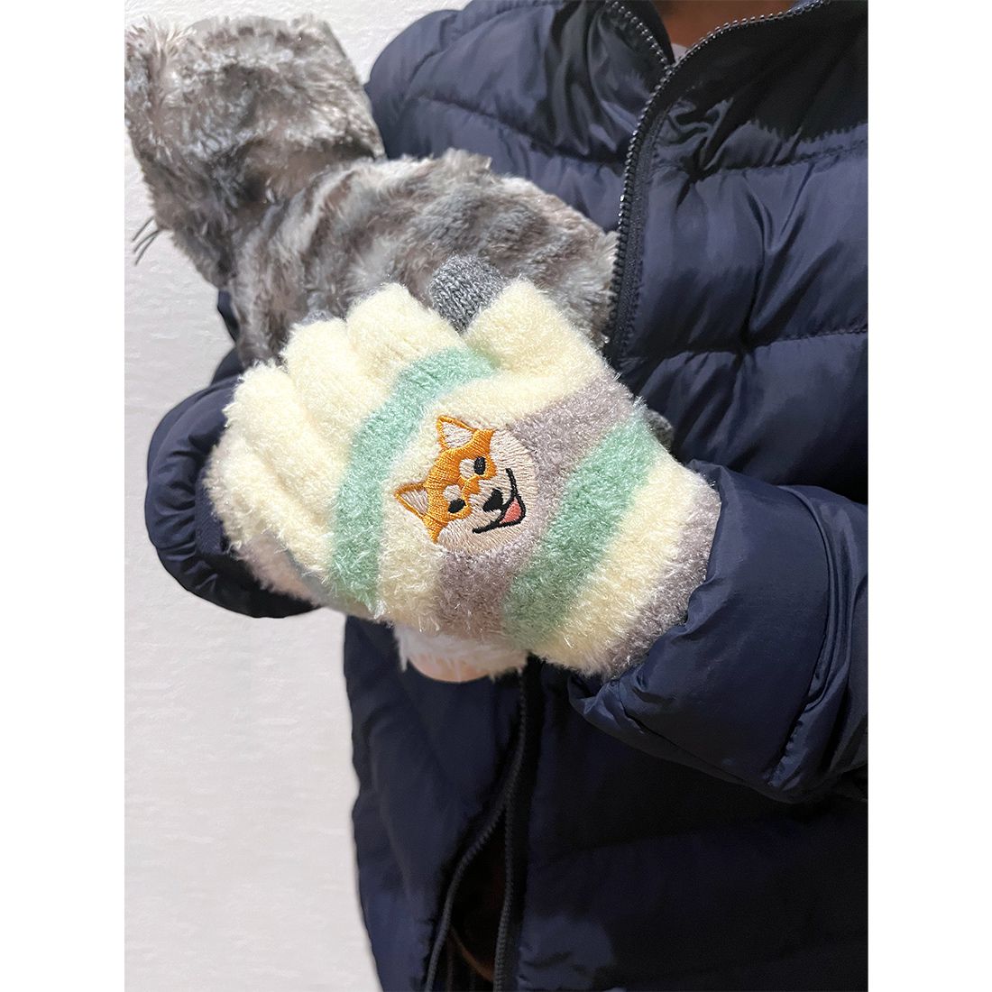 日本 TOMO - 兒童可觸控短絨保暖手套-柴犬-綠灰米