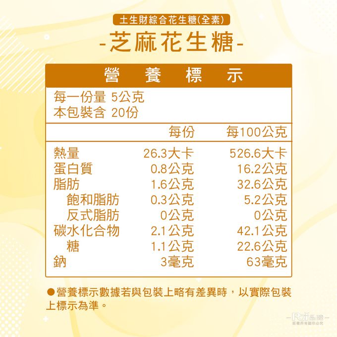 過敏原:【巧益】土生財:本產品含有花生、芝麻、麥芽、麩質穀物及其製品 【巧益】財大氣:本產品含有花生、芝麻、麩質穀物及其製品,不適合過敏體質者食用;本產品與其它有含花生、堅果類、芝麻、大豆、蛋、芒果及牛奶的產品於同一工廠生產,食物過敏者請留意。