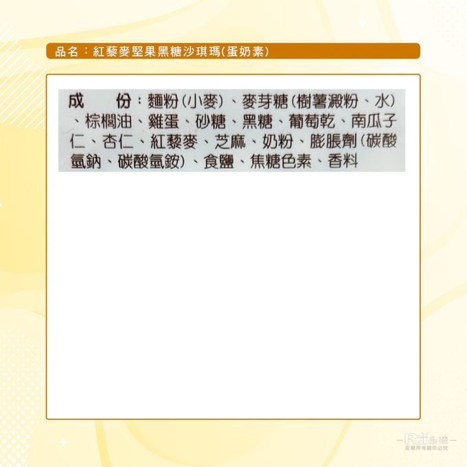 成分:麵粉(小麥)、麥芽糖(樹薯澱澱粉、水)、棕櫚油、雞蛋、砂糖、黑糖、葡萄乾、南瓜子仁、杏仁、紅藜麥、芝麻、奶粉、膨脹劑(碳酸氫鈉、碳酸氫銨)、食鹽、焦糖色素、香料