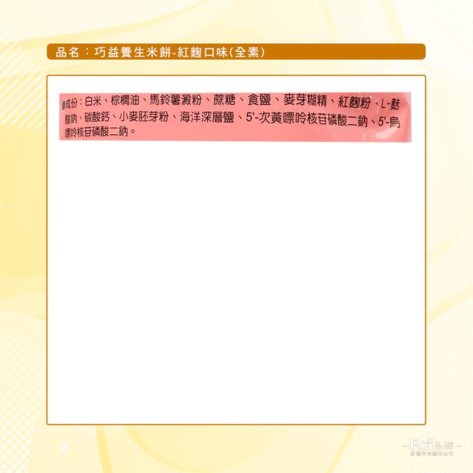 成分:白米、棕櫚油、馬鈴薯澱粉、蔗糖、食鹽、麥芽糊精、紅麹粉、L-麩酸鈉、碳酸鈣、小麥胚芽粉、海洋深層鹽、5'–次黃嘌呤核苷磷酸二鈉、5'–鳥嘌呤核苷磷酸二鈉