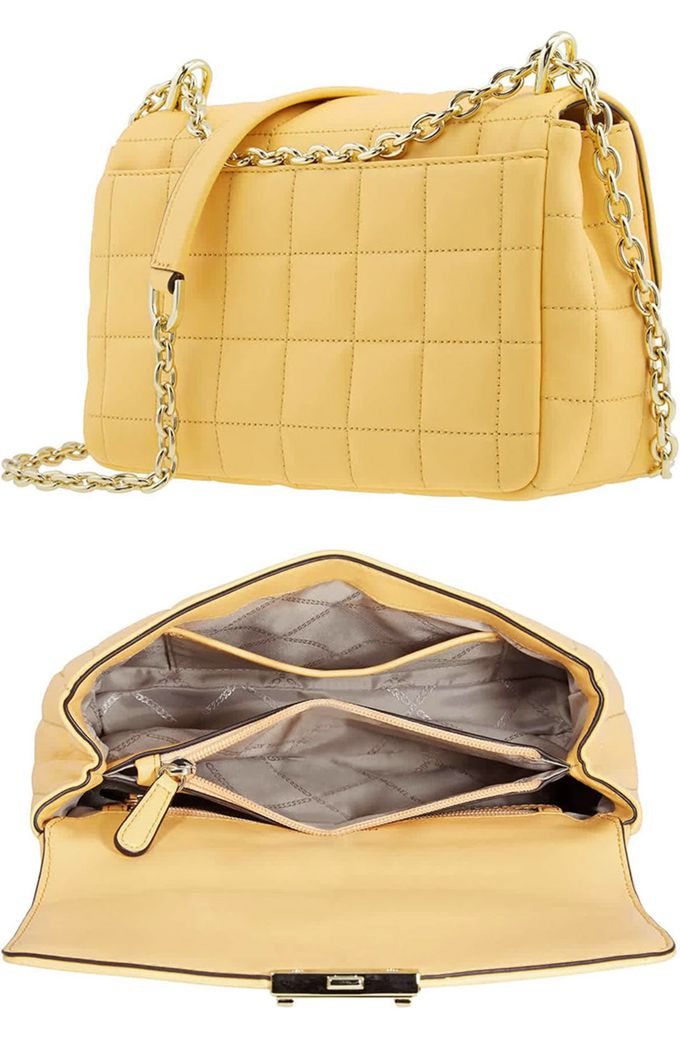 翻蓋格紋皮革斜背條包 (鵝黃色)