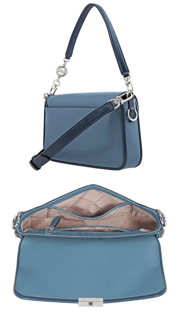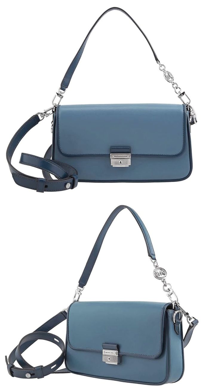 素面皮革翻蓋斜背包 (莫蘭迪藍)