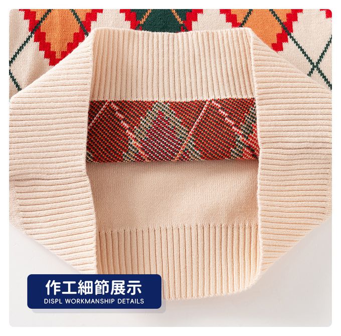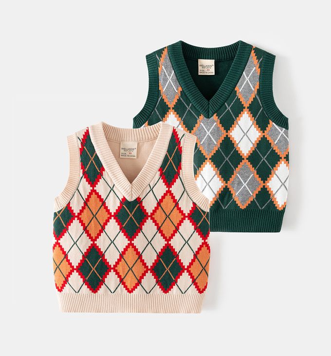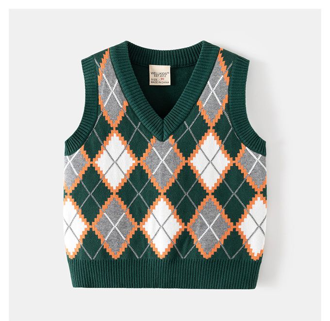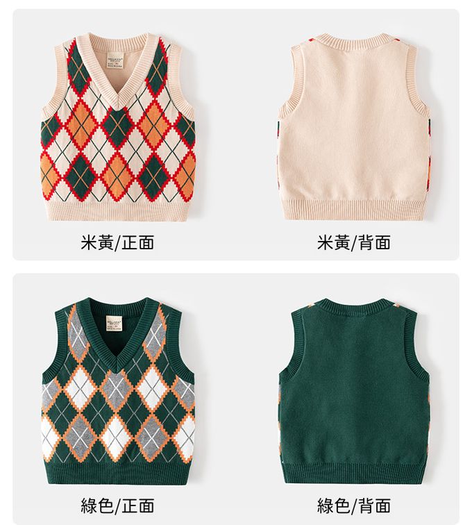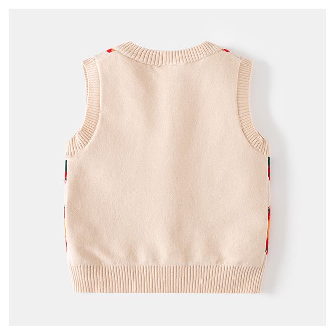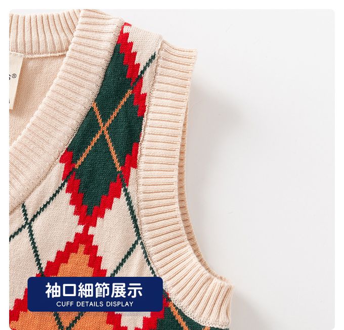 WELLKIDS - V領休閒針織背心-菱格與小熊-藏青+白