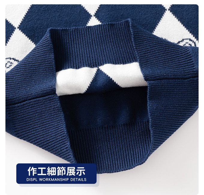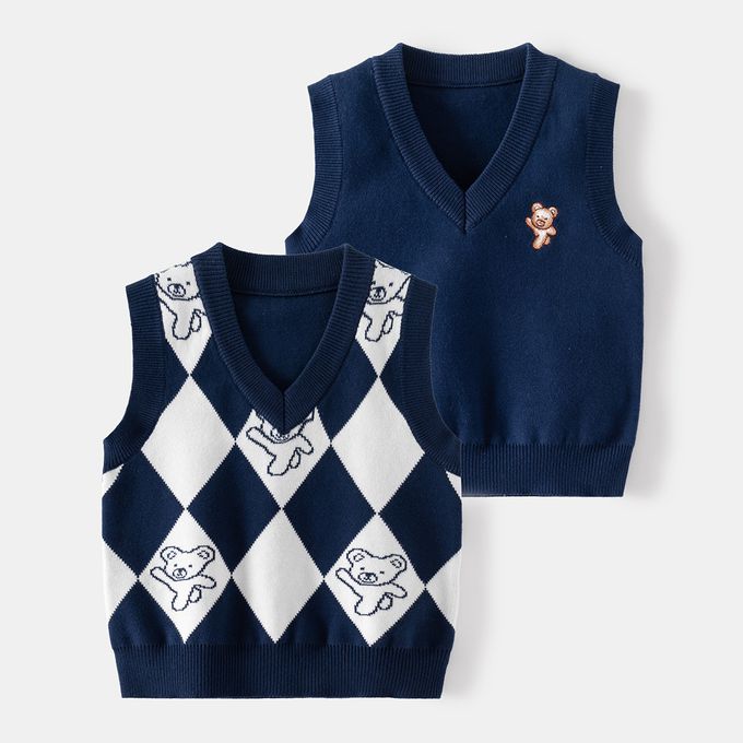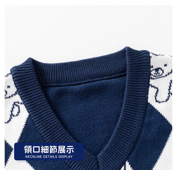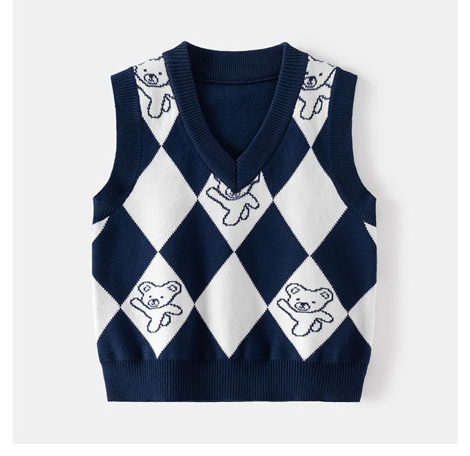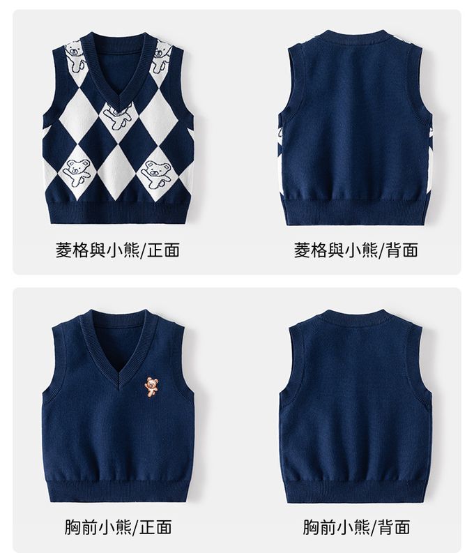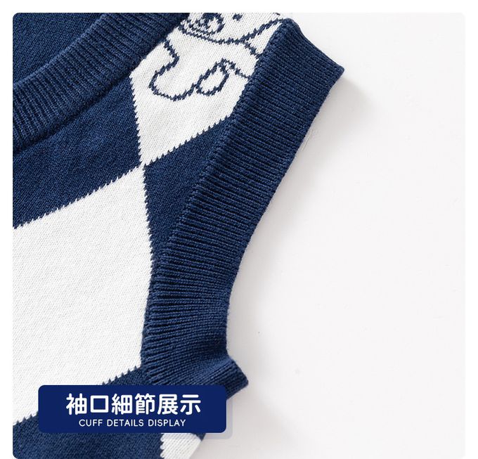 WELLKIDS - V領休閒針織背心-菱格與小熊-藏青+白