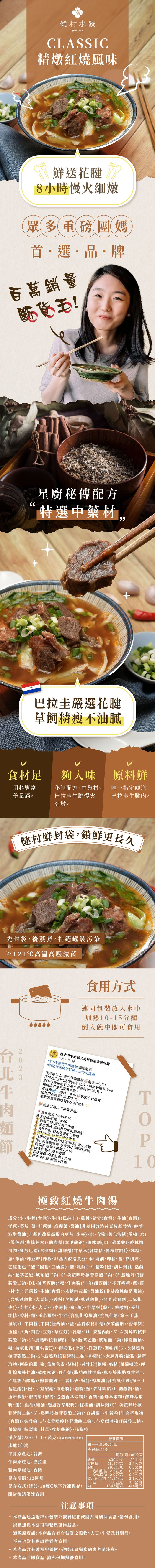 成分:水、牛骨(台灣)、牛肉(巴拉圭)、雞骨、豬骨(台灣)、牛油(台灣)、洋蔥、蕃茄、薑、紅蔥頭、高麗菜、醬油(非基因改造黄豆胺基酸液、純釀造生醬油(非基因改造高蛋白豆片、小麥)、水、食鹽、轉化液糖(蔗糖、水)、著色劑(焦糖色素)、防腐劑(本甲酸鈉)、調味劑(DL-蘋果酸)、酵母抽出物、红麹色素(含酒精)、甜味劑(甘草萃(含糊精、檸檬酸鈉))、冰糖、蔥、米酒、辣豆瓣[辣椒、非基因改造黄豆、水、麻油、味精、鹽、黏稠劑(乙醯化已二酸二澱粉、三仙膠)、糖、乳酸)、牛精粉(鹽、調味劑(L-麩酸鈉、胺基乙酸、琥珀酸二鈉、5'–次黃嘌呤核苷磷酸二鈉、5'–鳥嘌呤核苷磷酸二鈉、DL-胺基丙酸)、糖、牛肉粉(牛肉(紐西蘭)、麥芽糊精、蔥、薑、桂皮)、洋蔥粉、牛油(台灣)、木糖酵母粉、醬油粉(非基改純釀造醬油)(含麩質穀物、大豆類)、香料(含奶類、麩質穀物)、品質改良劑(二氧化矽))、老抽(水、大豆、小麥澱粉、鹽、糖)、牛晶粉(鹽、L-麩酸鈉、麥芽糊精、香料、糖、玉米澱粉、牛油(含氫化棕櫚油、抗氧化劑(第三丁基氫醌))、牛肉粉(牛肉(紐西蘭)、鹽、品質改良用劑(多磷酸鈉)、香辛料(玉桂、八角、茴香、豆蔻、草豆蔻)、乳糖、DL-胺基丙酸、5'–次黃嘌呤核苷磷酸二鈉、5'–鳥嘌呤核苷磷酸二鈉、胺基乙酸、琥珀酸二鈉、檸檬酸鈉、糖、抗氧化劑(维生素E))、酵母粉(含鹽)、洋蔥粉、調味劑(5'–次黃嘌呤核苷磷酸二鈉、5'–鳥嘌呤核苷磷酸二鈉、檸檬酸)、大蒜香粉(澱粉、蒜萃取物、阿拉伯膠、鹽)焦糖色素、胡椒)、黄汁粉(麵粉、奶精(葡萄糖漿、硬化棕櫚核仁油、乾酪素鈉、乳化劑(脂肪酸甘油酯、單及雙脂肪酸甘油二乙醯酒石酸酯)、檸檬酸鉀、二氧化矽、鹽)、棕櫚油(含抗氧化劑(第三丁基氫醌))、鹽、L-麩酸鈉、洋蔥粉)、雞粉(鹽、麥芽糊精、L-麩酸鈉、糖、玉米澱粉、雞肉粉(雞肉、迷迭香萃取物)、香料、酵母萃取物(酵母萃取物、鹽)、雞油(雞油、迷迭香萃取物)、棕櫚油、調味劑(5'–次黃嘌呤核苷磷酸二鈉、5'–鳥嘌呤核苷磷酸二鈉)、白胡椒、牛骨粉(牛肉萃取物(台灣)、麩酸鈉、5'–次黃嘌呤核苷磷酸二鈉、5'–鳥嘌呤核苷磷酸二鈉、葡萄糖、精製鹽、甘草、胺基酸鈉)、花椒粒