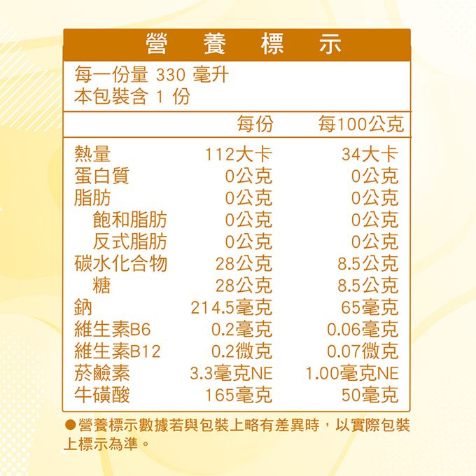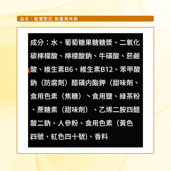 成分:水、葡萄糖果糖糖漿、二氧化碳檸檬酸、檸檬酸鈉、牛磺酸、菸鹼酸、維生素B6、維生素B12、苯甲酸鈉(防腐劑)、醋磺内酯鉀(甜味劑、食用色素(焦糖)、食用鹽、綠茶粉、蔗糖素(甜味劑)、乙烯二胺四醋酸二鈉、人參粉、食用色素(黃色四號、紅色四十號)、香料