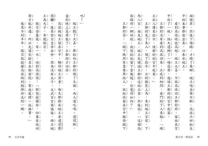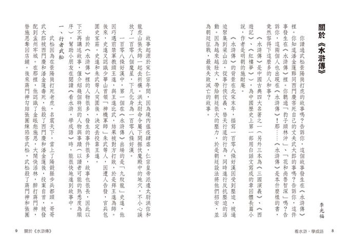 這本書以成語作為章節段落,每個成語章節包含「成語釋義」、「成語例句」、「同義成語」、「成語填充練習題」等部分,而最精彩的,無疑是一章節加入一個《水滸傳》的選段作為靈魂,讓讀者參與成語學習時,呈現很高的黏著度。