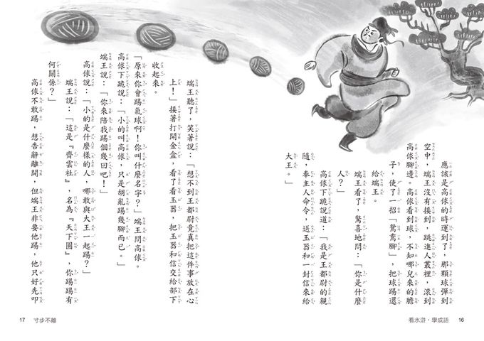 《看水滸,學成語》承接《看三國,學成語》和《看西遊,學成語》的編寫形式,有成語故事、語義和使用範例,有同義詞和成語家族(句子中有共同的字的成語),還有動動腦和成語加油站,提供小朋友加深、加廣的學習機會,進而學會更多成語。