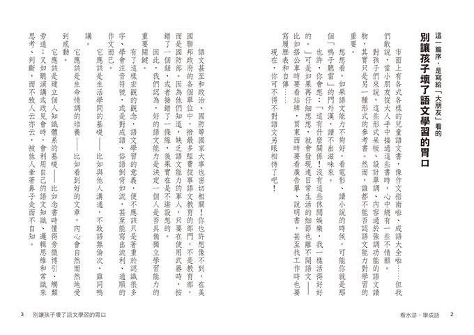 例如談「面黃肌瘦」時,本書搭配了魯智深出家時看到「瓦罐寺」的和尚受到強盜欺負,三餐不繼的樣子,「面黃肌瘦」這個成語便與主角的行俠仗義結合起來,豐富了學習的深度與情感厚度;我特別喜歡像是「將計就計」這幾個段落,搭配了《水滸傳》裡團隊合作的情節,描述戴宗被害,朱貴將計就計,把危機化為轉機的做法與效果,讓讀者充分進入到「將計就計」的具體情境,感受人物角色遇事冷靜的態度和跳脫的思考模式,這些緊張刺激的故事,必然把這個成語推送到孩子的心底,也將形諸他們的筆頭,成為寫作時靈活運用詞彙的來源。