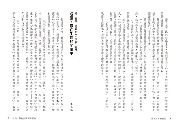 在閱讀經典文學時,可以沉浸於精彩刺激的故事中,還能自然而然的習得語文常識及成語運用,應該是最棒的附加價值!李光福老師再次以他深厚的寫作功力,以及豐富的教學經驗,為孩子們打造了一座學習城堡,無論是否熟悉《水滸傳》原典,都能在這本淺顯易懂又生動有趣的《看水滸,學成語》中,讀到且讀懂原書最精華最吸睛的故事情節。不但如此,還能透過光福老師精心設計的同義詞、成語家族、動動腦筋和成語加油站,來熟練成語的運用,進而提升語文素養。