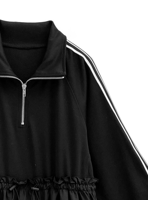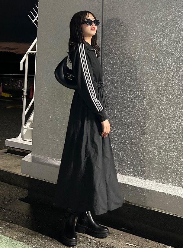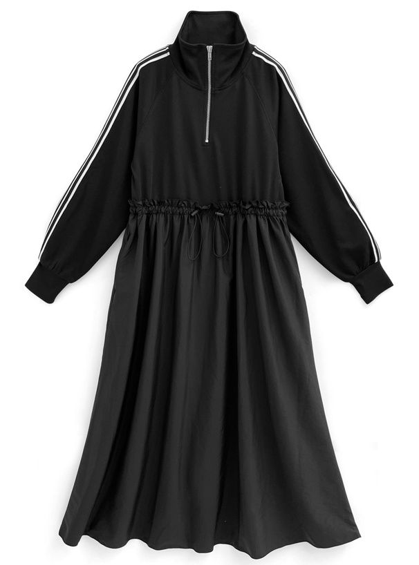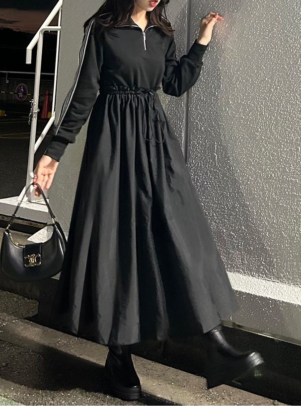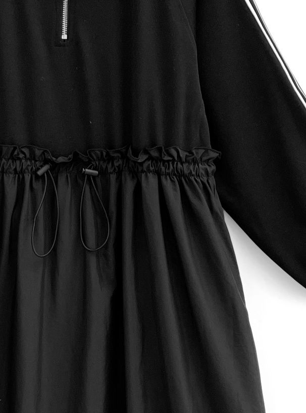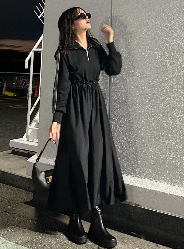 • 品名:運動風拉鍊翻領抽繩腰長袖洋裝