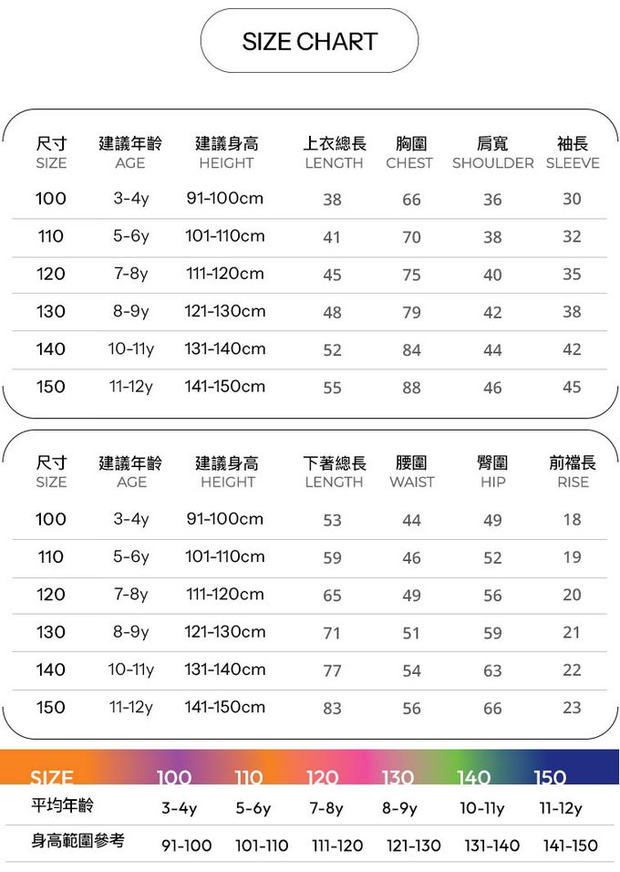 尺寸從100-150公分都有,大小孩和小寶貝都可以穿!