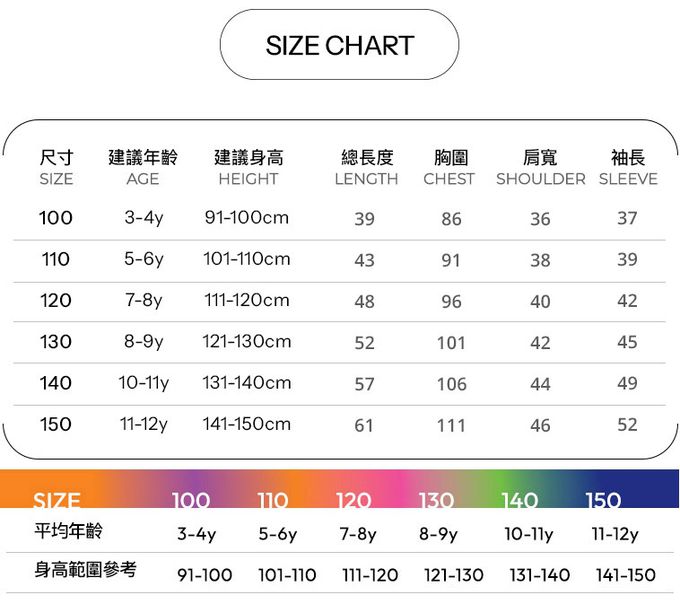 1. 尺寸表單位皆為公分(cm),實際尺寸會因布料彈性、水洗、測量起迄點等因素略有誤差。建議參考孩子平時穿著衣物尺寸進行選購。