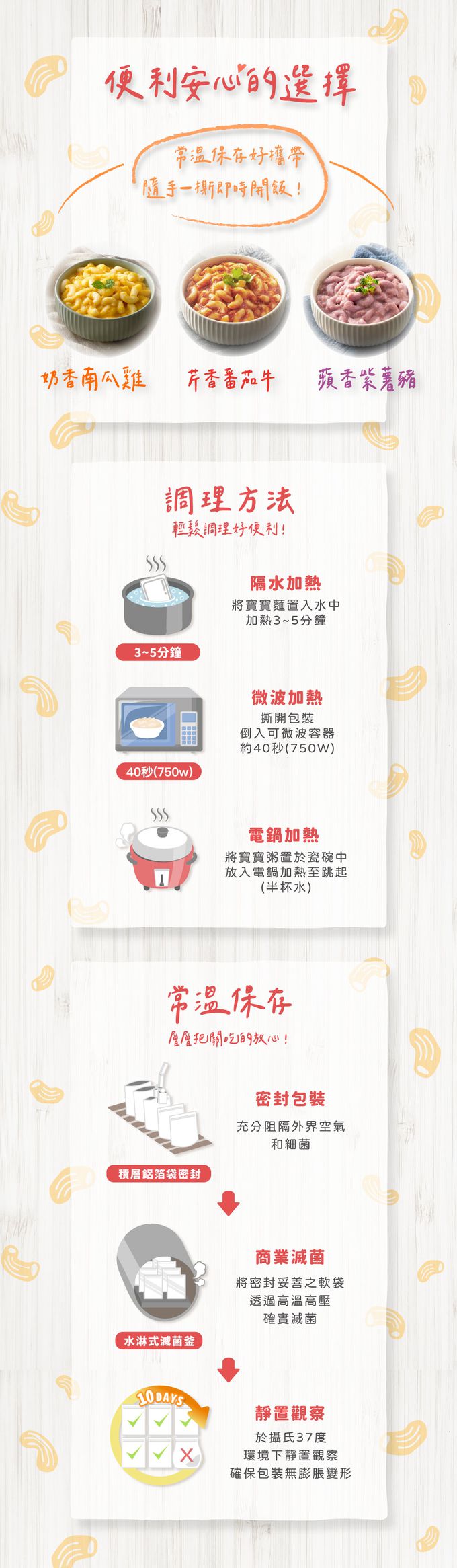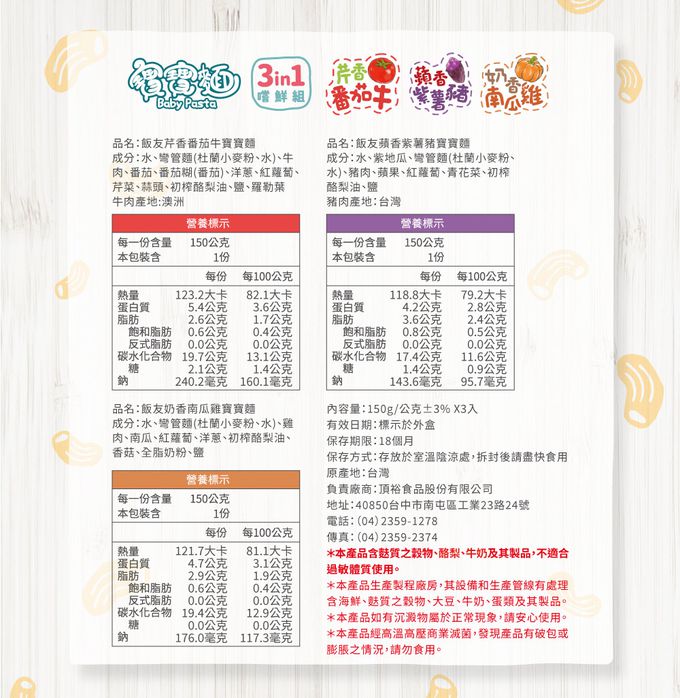 成分:<奶香南瓜雞寶寶麵> 成分:水、彎管麵(杜蘭沙粒粉、水)、雞肉、南瓜、紅蘿蔔、洋蔥、初榨酪梨油、香菇、南瓜粉、全脂奶粉、鹽 <芹香番茄牛寶寶麵> 成分:水、彎管麵(杜蘭沙粒粉、水)、牛肉、番茄、番茄糊(番茄)、洋蔥、紅蘿蔔、芹菜、蒜頭、初榨酪梨油、鹽、羅勒葉 <蘋香紫薯豬寶寶麵> 成分:水、紫地瓜、彎管麵(杜蘭沙粒粉、水)、豬肉、蘋果、紅蘿蔔、青花菜、初榨酪梨油、鹽
