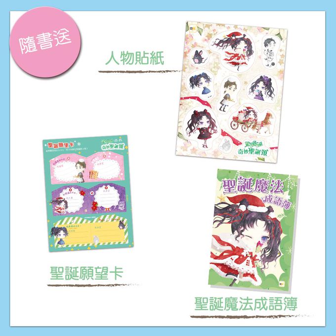 此外,除了《魔法成語簿》,還配合書中的主題,另外搭贈了兩樣贈品:《人物貼紙》與應景的節日小禮卡──《聖誕願望卡》,希望小讀者在閱讀跟學習之外,能從中獲得更多樂趣。