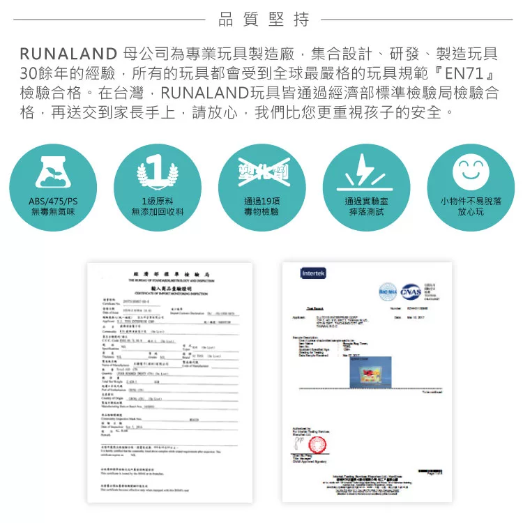 產品相關安全檢驗報告:通過歐盟EN71玩具安全標準:跌落測試、衝擊測試、易燃性測試、19項毒物檢驗、安全音量測試、ABS塑膠無氣味