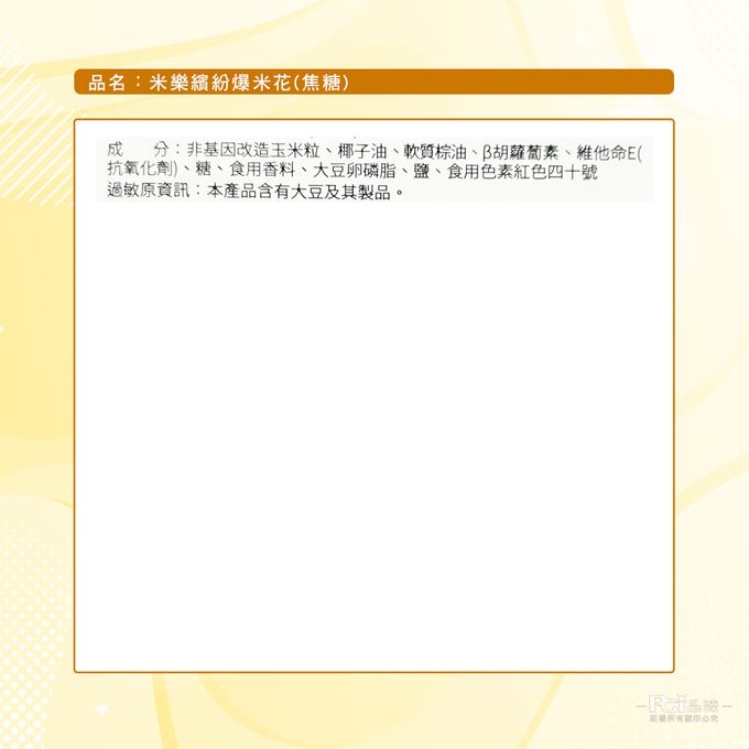 成分:非基因改造玉米粒、椰子油、軟質棕油、B胡蘿蔔素、維他命E(抗氧化劑)、糖、食用香料、大豆卵磷脂、鹽、食用色素紅色四十號
