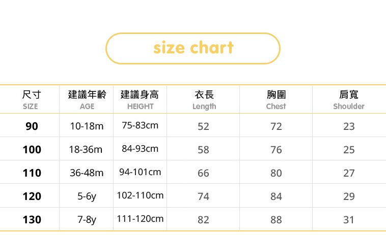 1. 尺寸表單位皆為公分(cm),實際尺寸會因布料彈性、水洗、測量起迄點等因素略有誤差。建議參考孩子平時穿著衣物尺寸進行選購。2. 建議以30度以下冷水,單獨手洗,以免造成移染或掉色。3. 如需機洗,請務必將衣服翻面放入洗衣網、再放洗衣機,以免刮損圖樣。(若有標註不可機洗或乾洗,請勿機洗、乾洗)4. 若含牛仔布、有色布料容易互相染色,請分開或單獨洗滌,以免相互移染。請使用中性洗劑。浸泡時間不宜過長。5. 請勿使用漂白劑、螢光增白劑及衣物柔軟劑,以免破壞布料或導致掉色。6. 洗滌後立刻晾乾,切勿使用烘衣機。過分烘乾可能會破壞織物纖維、導致衣物收縮。7. 如有熨燙需求,請低溫熨燙。8. 每件商品於拍攝時均力求忠實呈現,但因每台電腦、手機或平板等設備之螢幕亮度、解析度不同,可能會有些許色差,謝謝媽咪爸比們的體諒。9. 提醒您,七天猶豫期並非七天試用期呦!商品需保持全新、完整包裝始可申請退換貨,造成不便敬請見諒。10. 預購為海外同步代購,如遇缺貨會儘速通知、協助取消訂單/退款等事宜。