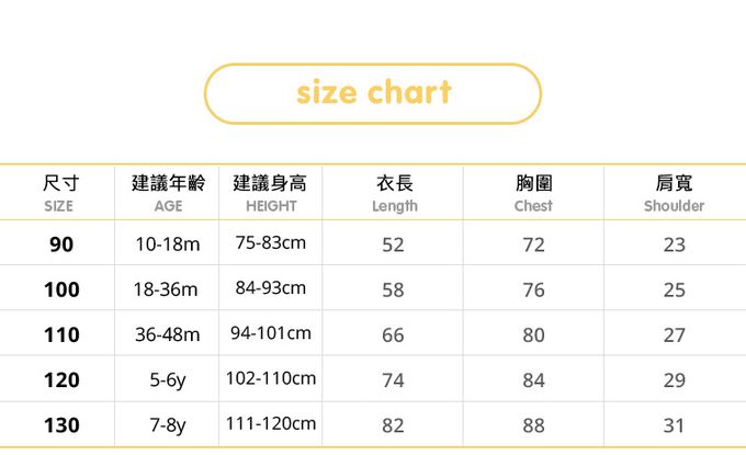 1. 尺寸表單位皆為公分(cm),實際尺寸會因布料彈性、水洗、測量起迄點等因素略有誤差。建議參考孩子平時穿著衣物尺寸進行選購。