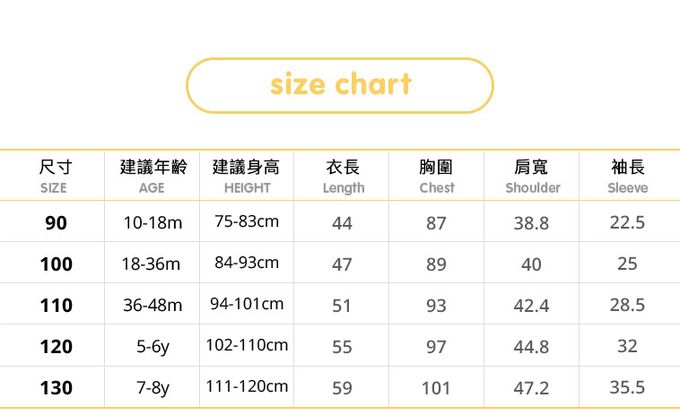 1. 尺寸表單位皆為公分(cm),實際尺寸會因布料彈性、水洗、測量起迄點等因素略有誤差。建議參考孩子平時穿著衣物尺寸進行選購。2. 建議以30度以下冷水,單獨手洗,以免造成移染或掉色。3. 如需機洗,請務必將衣服翻面放入洗衣網、再放洗衣機,以免刮損圖樣。(若有標註不可機洗或乾洗,請勿機洗、乾洗)4. 若含牛仔布、有色布料容易互相染色,請分開或單獨洗滌,以免相互移染。請使用中性洗劑。浸泡時間不宜過長。5. 請勿使用漂白劑、螢光增白劑及衣物柔軟劑,以免破壞布料或導致掉色。6. 洗滌後立刻晾乾,切勿使用烘衣機。過分烘乾可能會破壞織物纖維、導致衣物收縮。7. 如有熨燙需求,請低溫熨燙。8. 每件商品於拍攝時均力求忠實呈現,但因每台電腦、手機或平板等設備之螢幕亮度、解析度不同,可能會有些許色差,謝謝媽咪爸比們的體諒。9. 提醒您,七天猶豫期並非七天試用期呦!商品需保持全新、完整包裝始可申請退換貨,造成不便敬請見諒。10. 預購為海外同步代購,如遇缺貨會儘速通知、協助取消訂單/退款等事宜。