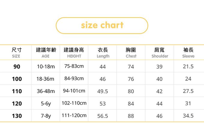 1. 尺寸表單位皆為公分(cm),實際尺寸會因布料彈性、水洗、測量起迄點等因素略有誤差。建議參考孩子平時穿著衣物尺寸進行選購。2. 建議以30度以下冷水,單獨手洗,以免造成移染或掉色。3. 如需機洗,請務必將衣服翻面放入洗衣網、再放洗衣機,以免刮損圖樣。(若有標註不可機洗或乾洗,請勿機洗、乾洗)4. 若含牛仔布、有色布料容易互相染色,請分開或單獨洗滌,以免相互移染。請使用中性洗劑。浸泡時間不宜過長。5. 請勿使用漂白劑、螢光增白劑及衣物柔軟劑,以免破壞布料或導致掉色。6. 洗滌後立刻晾乾,切勿使用烘衣機。過分烘乾可能會破壞織物纖維、導致衣物收縮。7. 如有熨燙需求,請低溫熨燙。8. 每件商品於拍攝時均力求忠實呈現,但因每台電腦、手機或平板等設備之螢幕亮度、解析度不同,可能會有些許色差,謝謝媽咪爸比們的體諒。9. 提醒您,七天猶豫期並非七天試用期呦!商品需保持全新、完整包裝始可申請退換貨,造成不便敬請見諒。10. 預購為海外同步代購,如遇缺貨會儘速通知、協助取消訂單/退款等事宜。