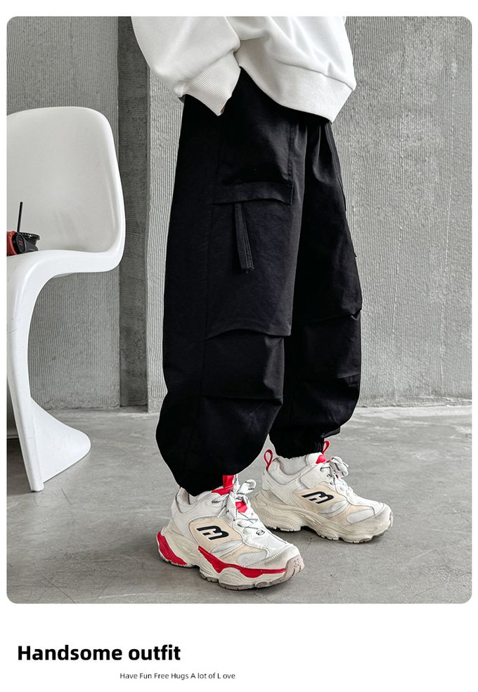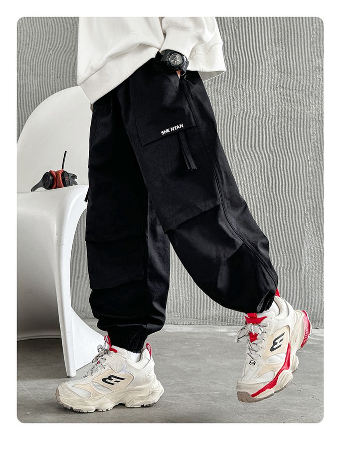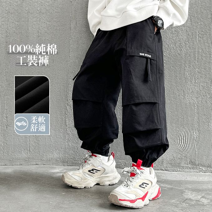 babybody - 純棉腰鬆緊打褶工裝長褲-黑色