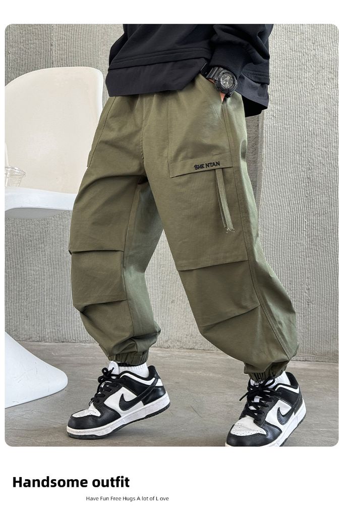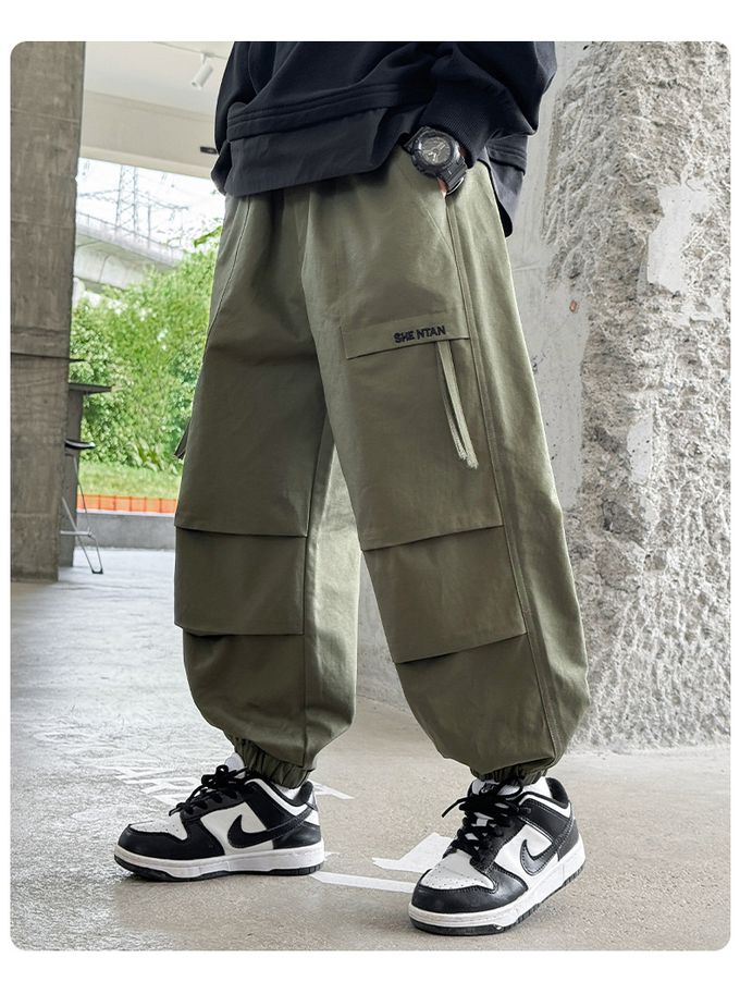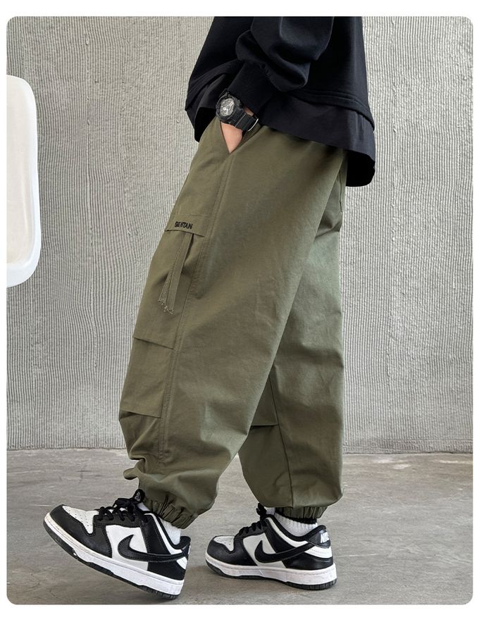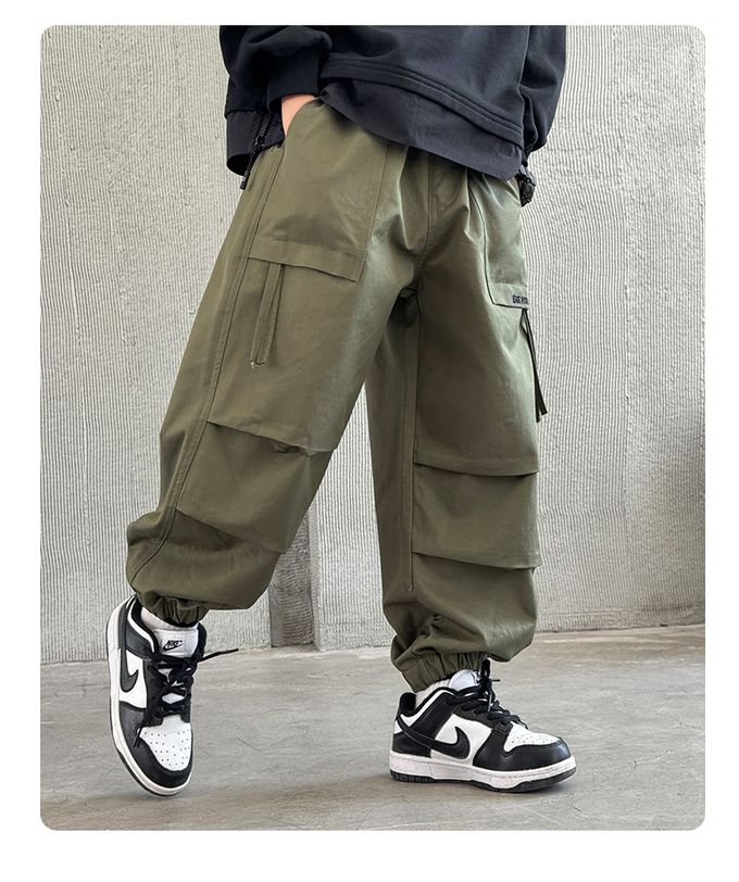 babybody - 純棉腰鬆緊打褶工裝長褲-軍綠色