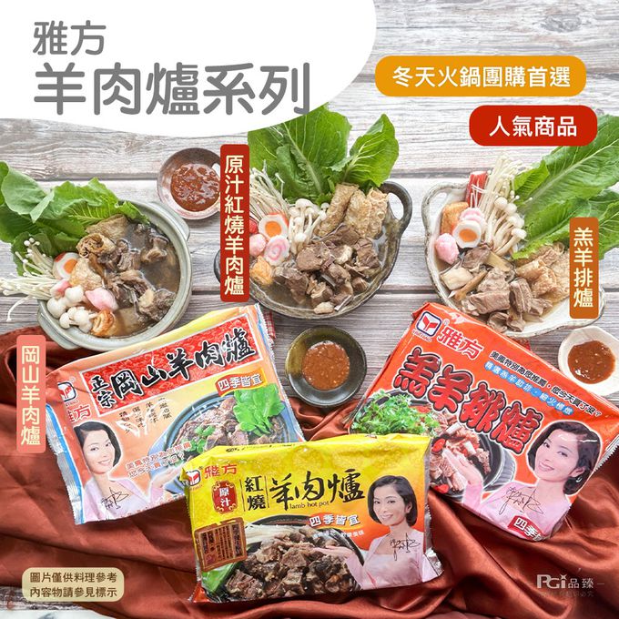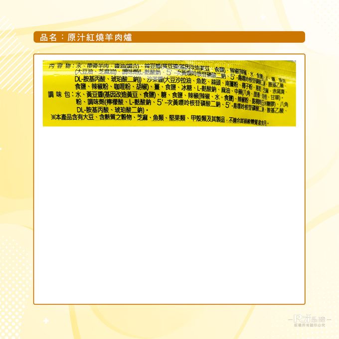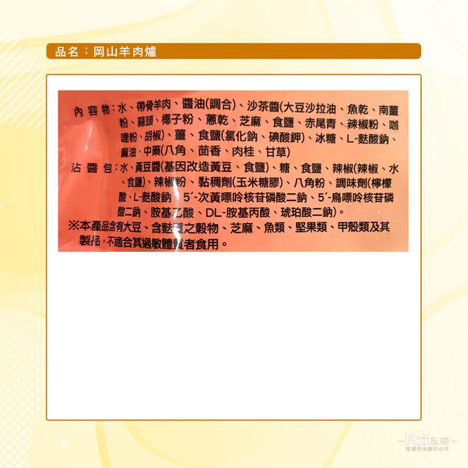 成分:原汁紅燒羊肉爐:内容物-水、帶骨羊肉、醬油(調合)、辣豆瓣(黃豆醬(基因改造黃豆、食鹽)、辣椒(辣椒、水、食鹽)、水、糖、香油(大豆油、芝麻油)、調味劑(L-麩酸鈉、5'–次黃嘌呤核苷磷酸二鈉、5'–鳥嘌呤核苷磷酸二鈉、胺基乙酸、DL-胺基丙酸、琥珀酸二鈉)、沙茶醬(大豆沙拉油、魚乾、蒜頭、南薑粉、椰子粉、蔥乾、芝麻、赤尾青、食鹽、辣椒粉、咖哩粉、胡椒)、薑、食鹽、冰糖、L-麩酸鈉、麻油、中藥(八角、茴香、肉桂、甘草)。 調味包-水、黃豆醬(基因改造黃豆、食鹽)、糖、食鹽、辣椒(辣椒、水、食鹽)、辣椒粉、黏稠劑(玉米糖膠)、八角粉、調味劑(檸檬酸、L-麩酸鈉、5'–次黃嘌呤核苷磷酸二鈉、5'–鳥嘌呤核苷磷酸二鈉、胺基乙酸、DL-胺基丙酸、琥珀酸二鈉)。 岡山羊肉爐:内容物-水、帶骨羊肉、醬油(調合)、沙茶醬(大豆沙拉油、魚乾、南薑粉、蒜頭、椰子粉、蔥乾、芝麻、食鹽、赤尾青、辣椒粉、咖哩粉、胡椒)、薑、食鹽(氯化鈉、碘酸鉀)、冰糖、L-麩酸鈉、麻油、中藥(八角、茴香、肉桂、甘草)。 沾醬包-水、黃豆醬(基因改造黃豆、食鹽)、糖、食鹽、辣椒(辣椒、水、食鹽)、辣椒粉、黏稠劑(玉米糖膠)、八角粉、調味劑(檸檬酸、L-麩酸鈉、5'–次黃嘌呤核苷磷酸二鈉、5'–鳥嘌呤核苷磷酸二鈉、胺基乙酸、DL-胺基丙酸、琥珀酸二鈉)。 羔羊排爐:内容物-水、帶骨羊肉、醬油(調合)、辣豆瓣醬(黃豆(基因改造)、辣椒、水、糖、食鹽、香油、L-麩酸鈉、5'–次黃嘌呤核苷磷酸二鈉、5'–鳥嘌呤核苷磷酸二鈉、胺基丙酸、琥珀酸二鈉、檸檬酸)、沙茶醬(大豆沙拉油、魚乾、蒜頭、薑粉、椰子粉、蔥乾、芝麻、赤尾青、辣椒粉、食鹽、胡荽、肉桂、茴香、胡椒)、薑、食鹽、糖、L-麩酸鈉、麻油、中藥(八角、茴香、肉桂、甘草)。 沾醬包-黃豆(基因改造)、辣椒、辣椒粉、水、八角粉、鹽、糖、調味劑(L-麩酸鈉、5'–次黃嘌呤核苷磷酸二鈉、5'–鳥嘌呤核苷磷酸二鈉、琥珀酸二鈉、檸檬酸)、黏稠劑(玉米糖膠)。