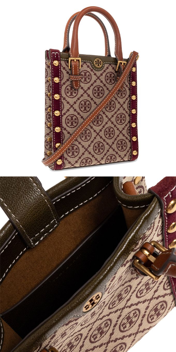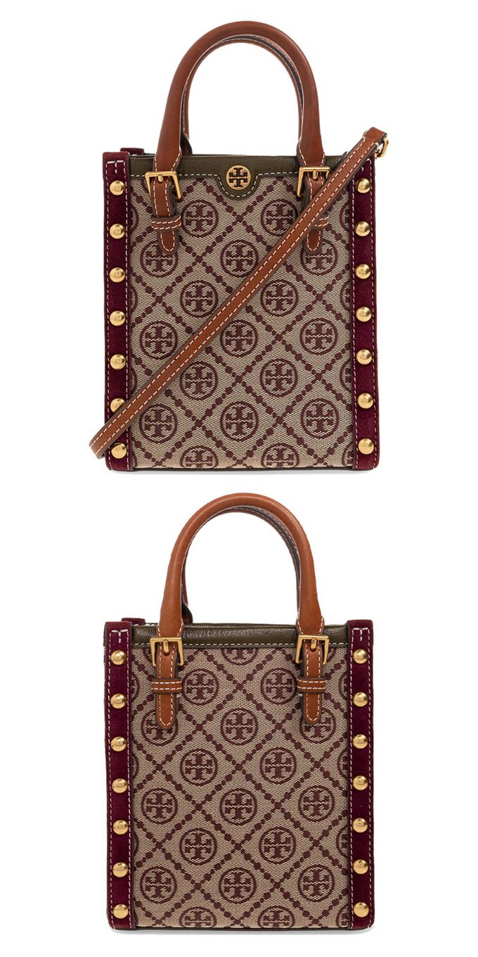 織布拼接皮革鉚釘兩用包 (卡其酒紅)