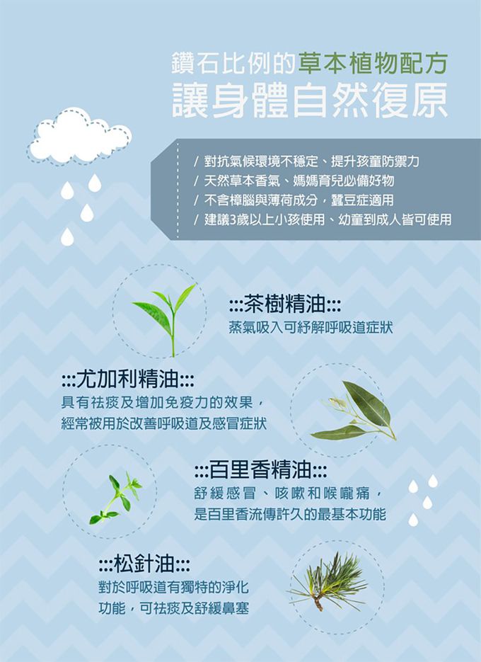 成分:尤加利精油、茶樹精油、百里香精油、純化松針油、松針油、落葉松針油及護膚配方