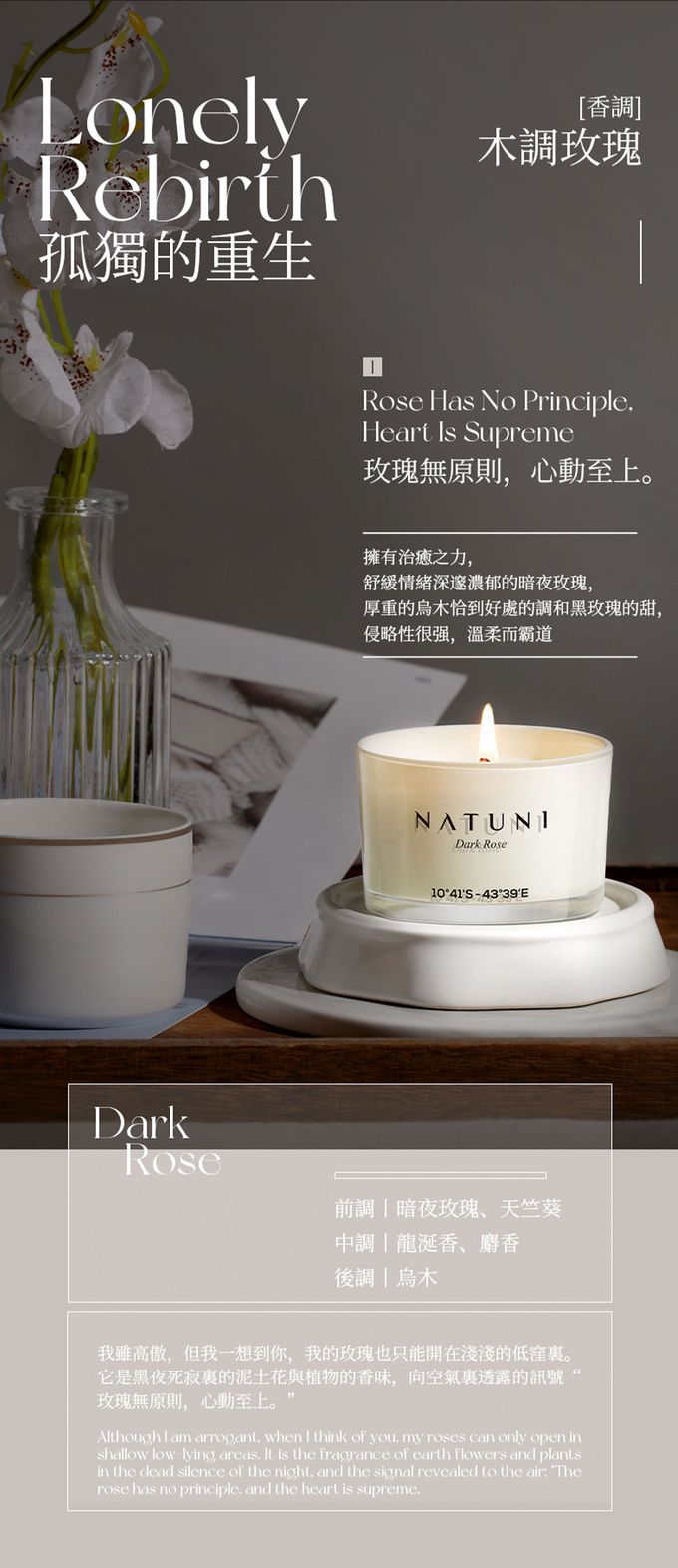 獨特的木質玫瑰香就像一個深沉卻又溫暖的懷抱,讓人感到無比的安心和放鬆。這不只是一款香薰,它是一次情感的重生旅程。