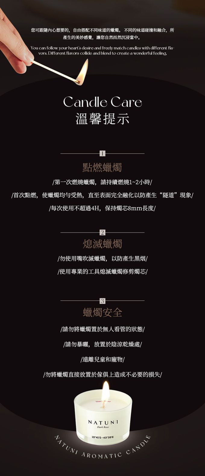 1.使用明火時,請務必留意保持空氣流通(避免缺氧),但不要將蠟燭放在風口處(火苗需中立無明顯晃動),並請留意幼童、寵物安全,以及避免易燃物接觸。